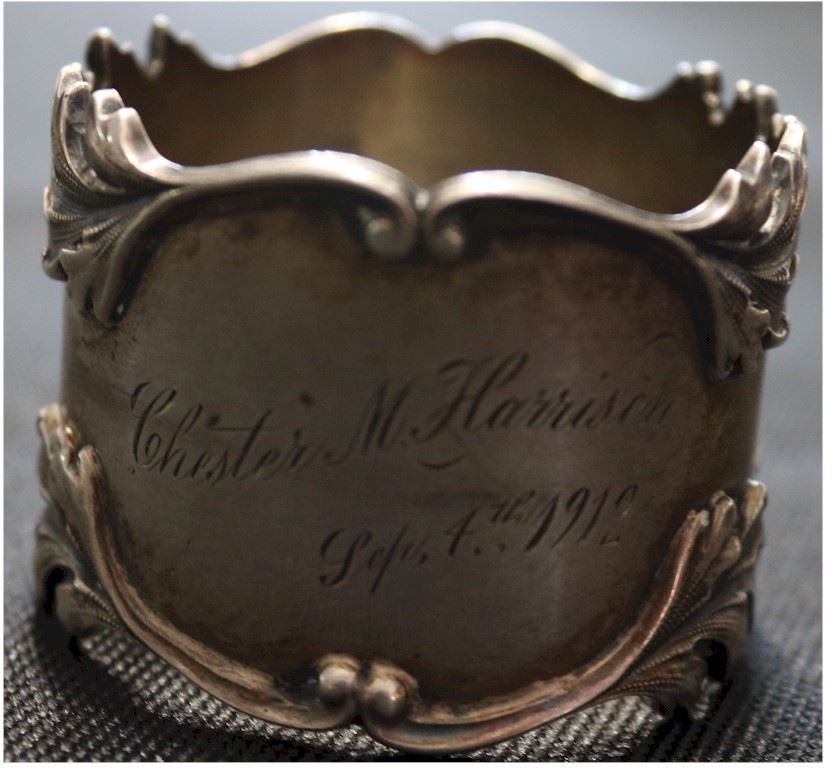 Estate Sterling Silver-Vintage Sterling Silver Napkin Holde engraved "Chester M Harrison Sept. 4th 1912. Holder features an attractive leaf pattern, and weighs 43 grams.