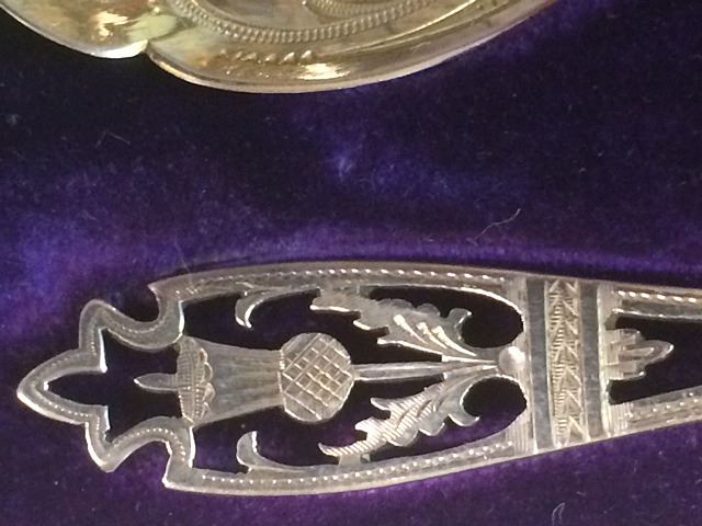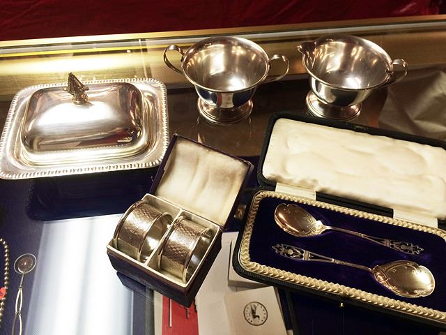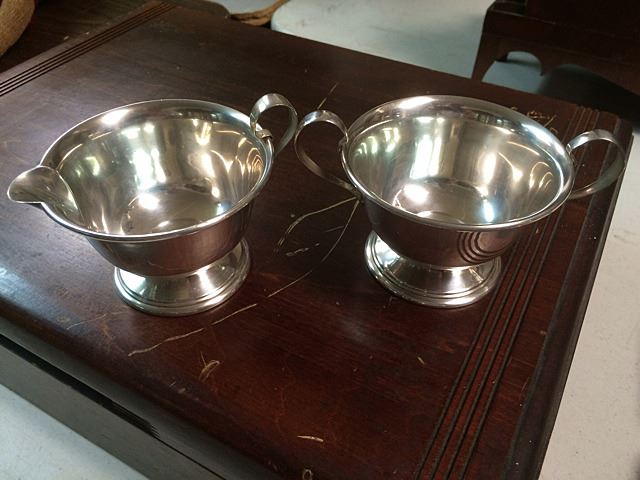 Estate Sterling and Silverplate Lot includes sterling silver sugar and creamer, 2 spoons in fitted case are believed to be European silver, 2 napkin rings with European mark believed to be silver, small covered dish is silver plate.