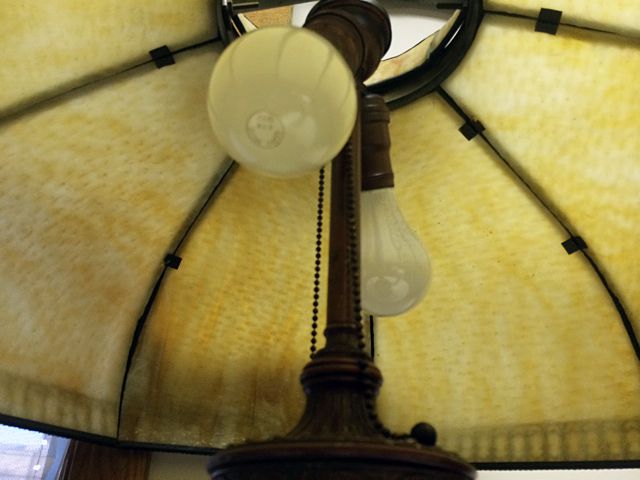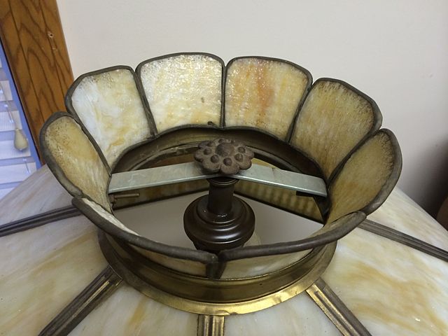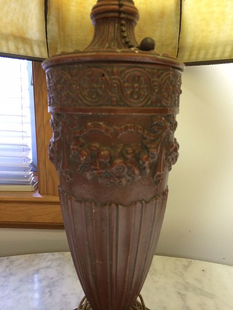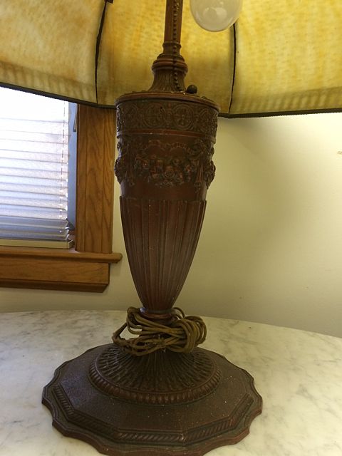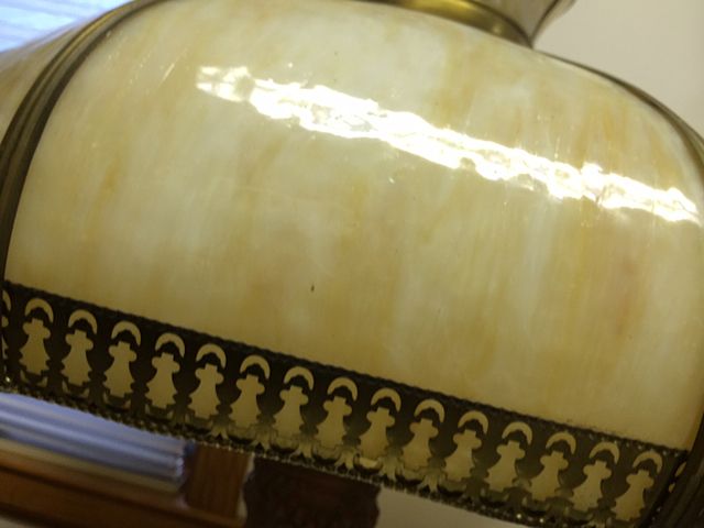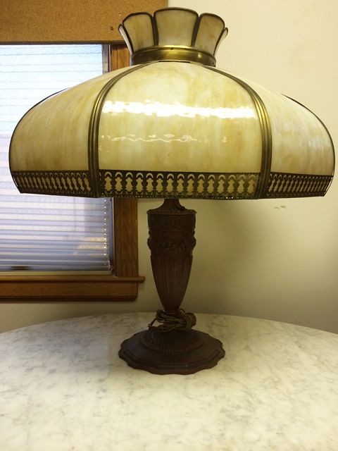Well over 100 years old! Estate Antique carmel slag glass table lamp with a very ornate base, all in very nice condition. The plug is frailed end on it.