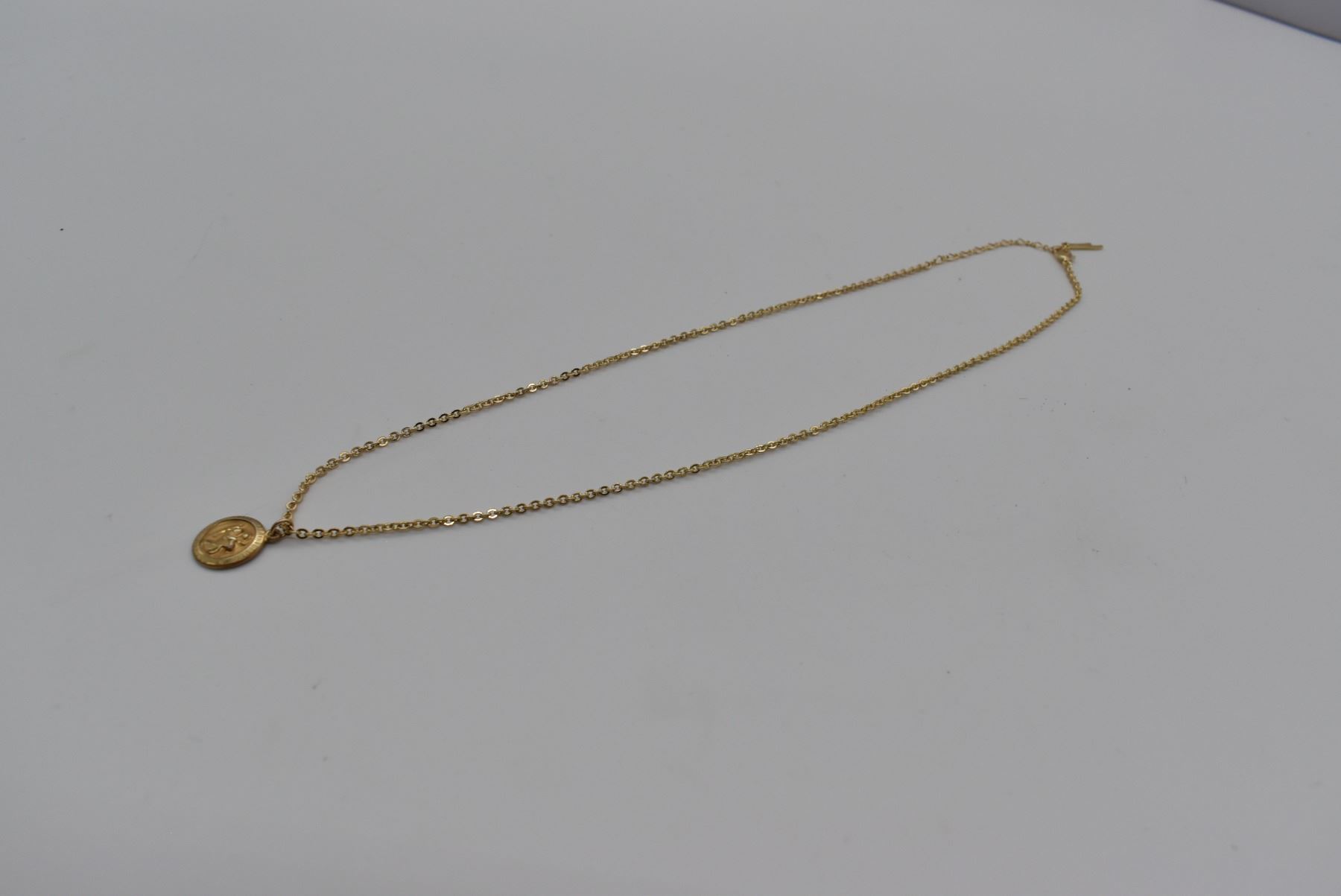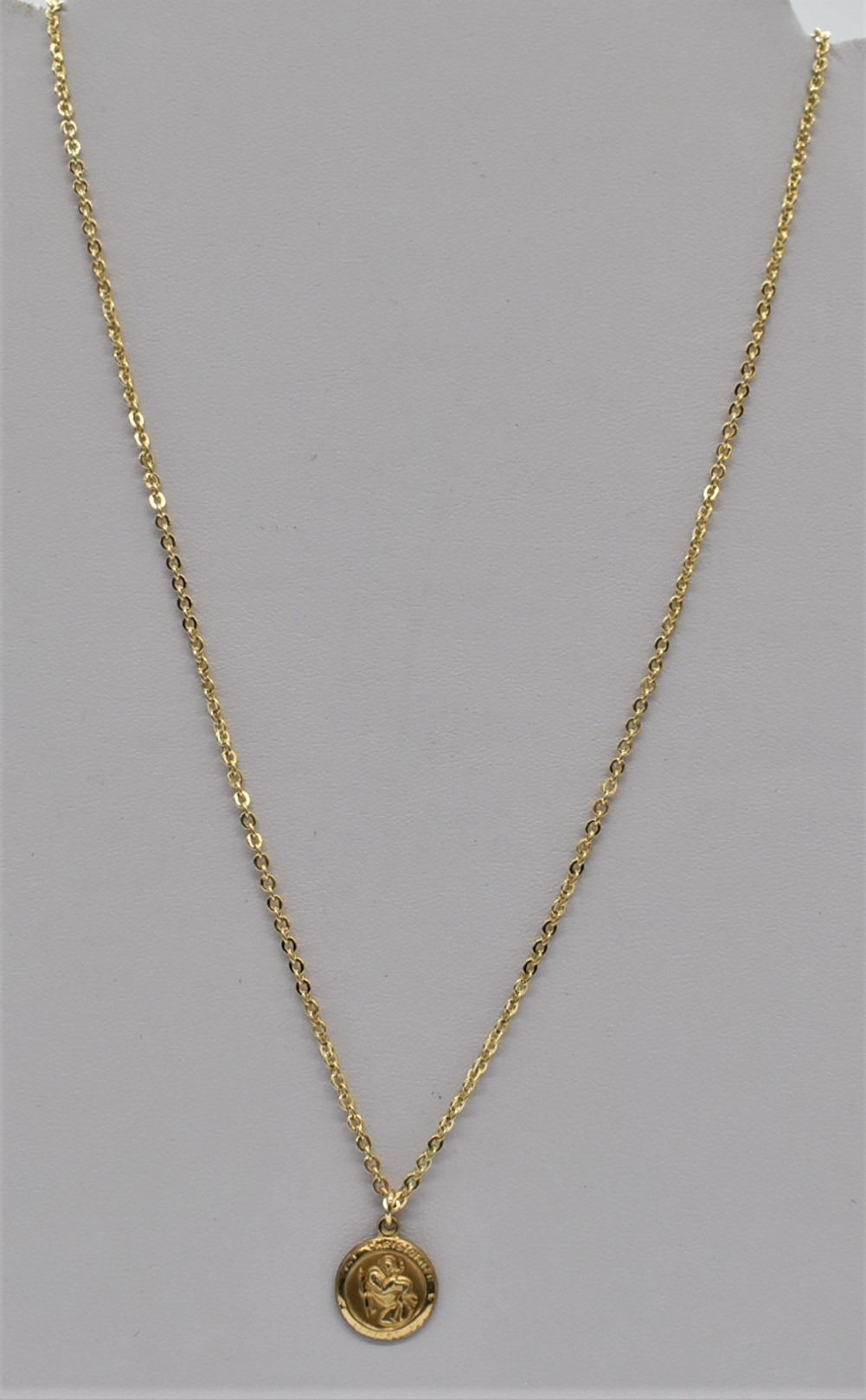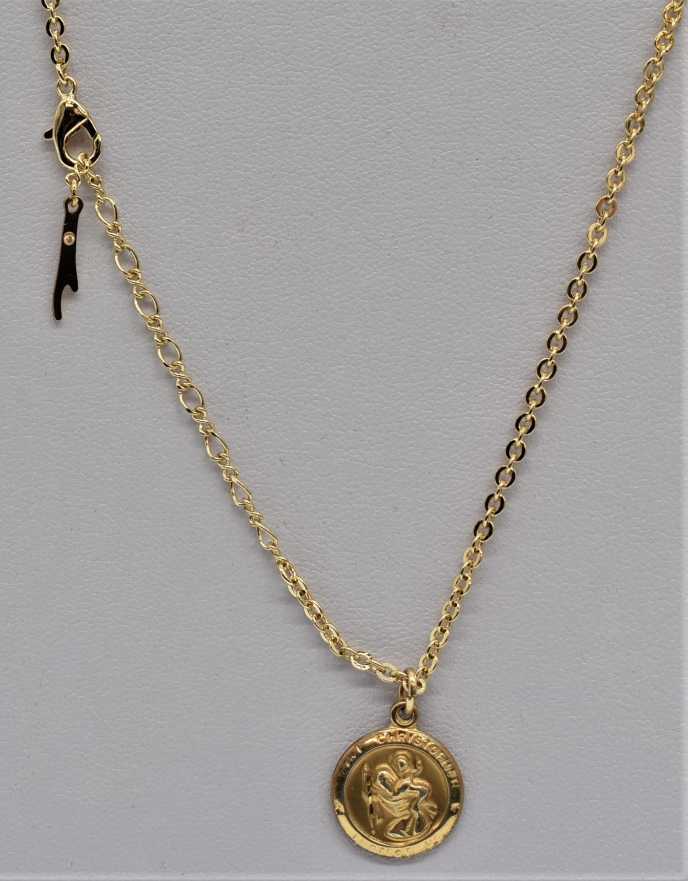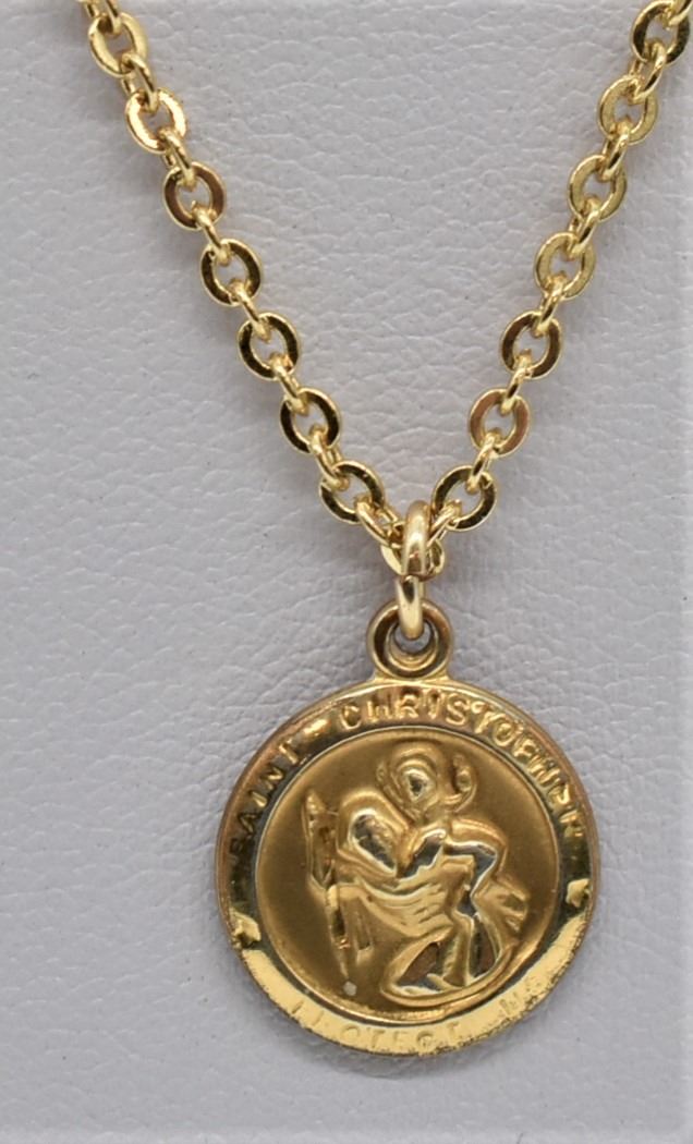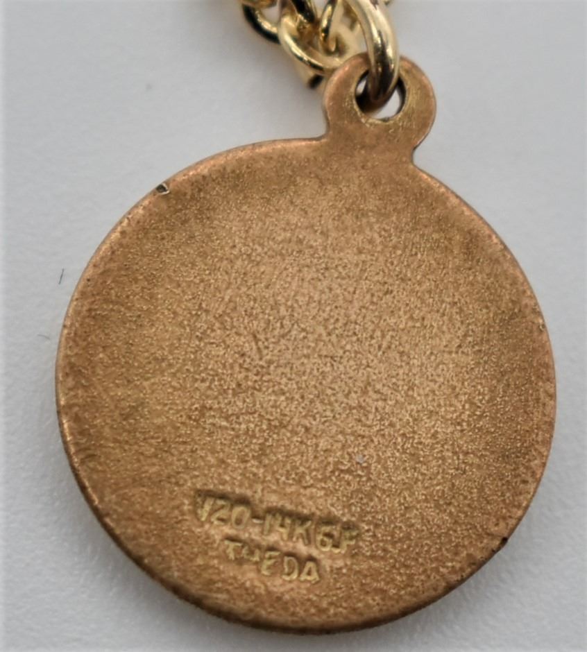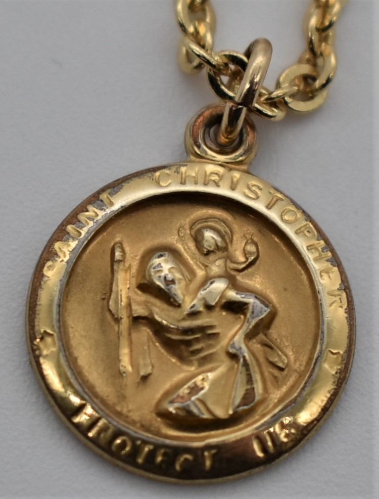Estate Theda 1/20 14K GF St. Christopher Protect Us Pendant Necklace, pendant measures .75''L which includes the bale x .5''D, marked on the back, gold tone chain measures 20''L end to end