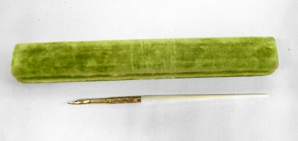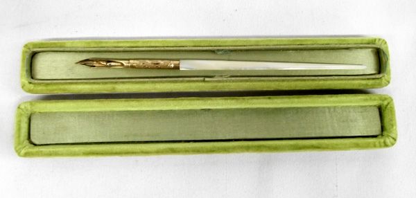 Estate Victorian Mother of Pearl Pen with Gold Nib, vintage Victorian quill pen, or dip pen, circa 1865. A dip pen nib marked Duryea Solid Gold X #2 has an iridescent rich solid mother of pearl shaft. Gold pens are usually tipped with iridium or some other durable alloy, and they do not wear rapidly. The pen is housed in its original velvet case, measures 6''L