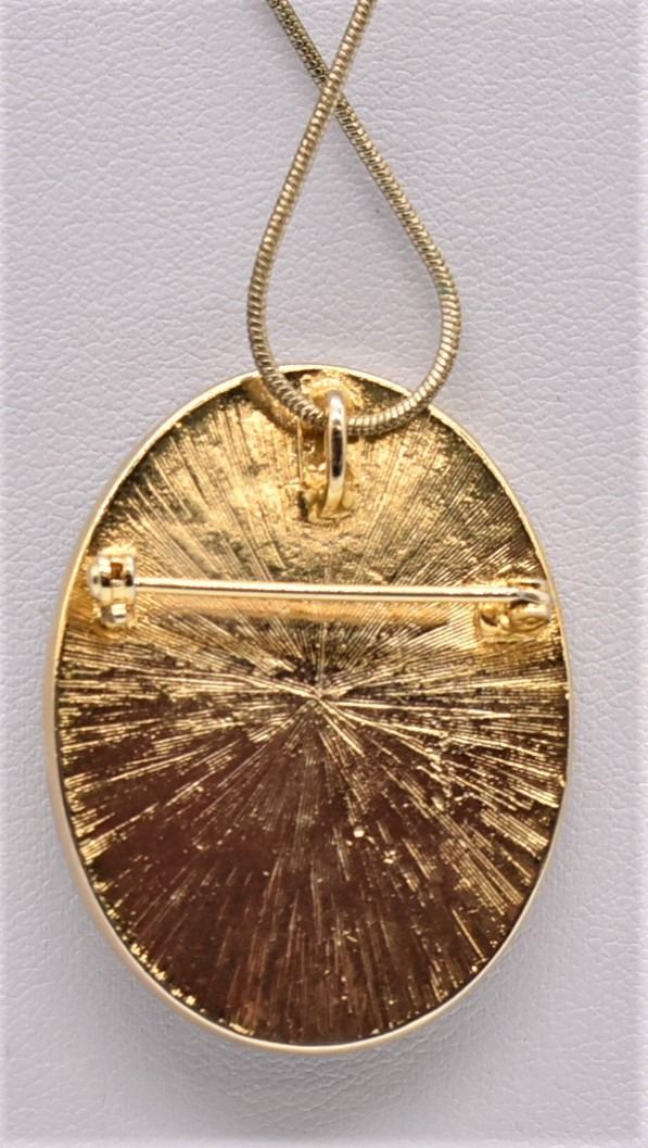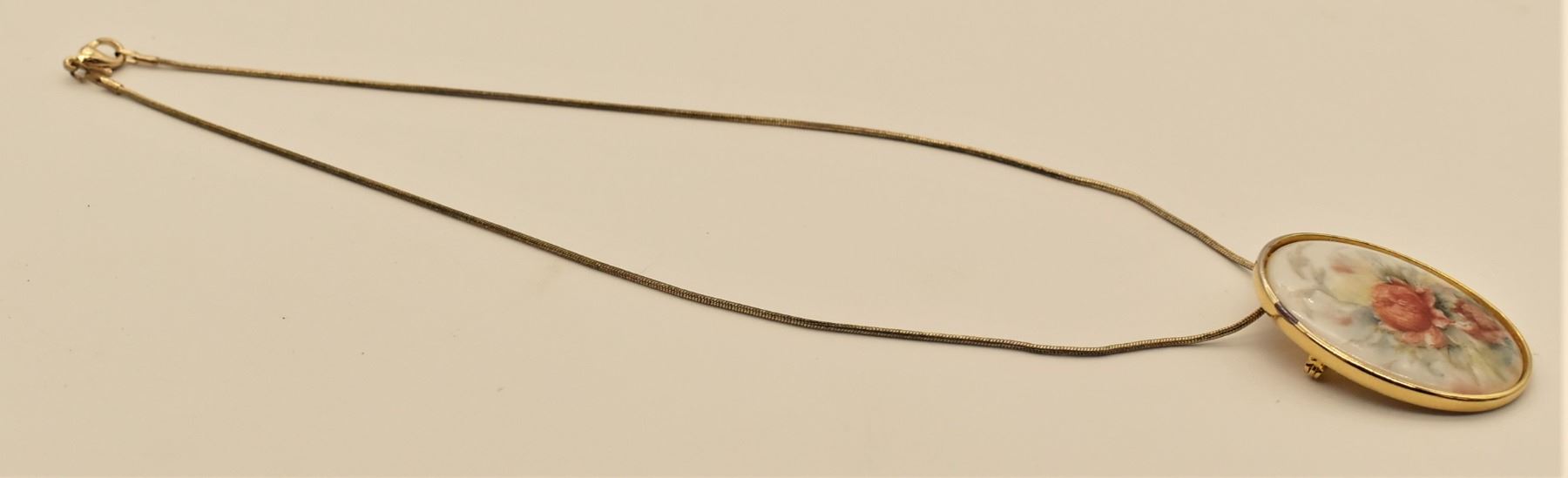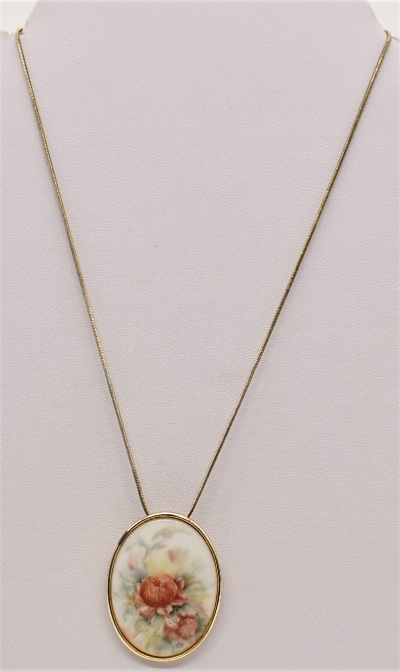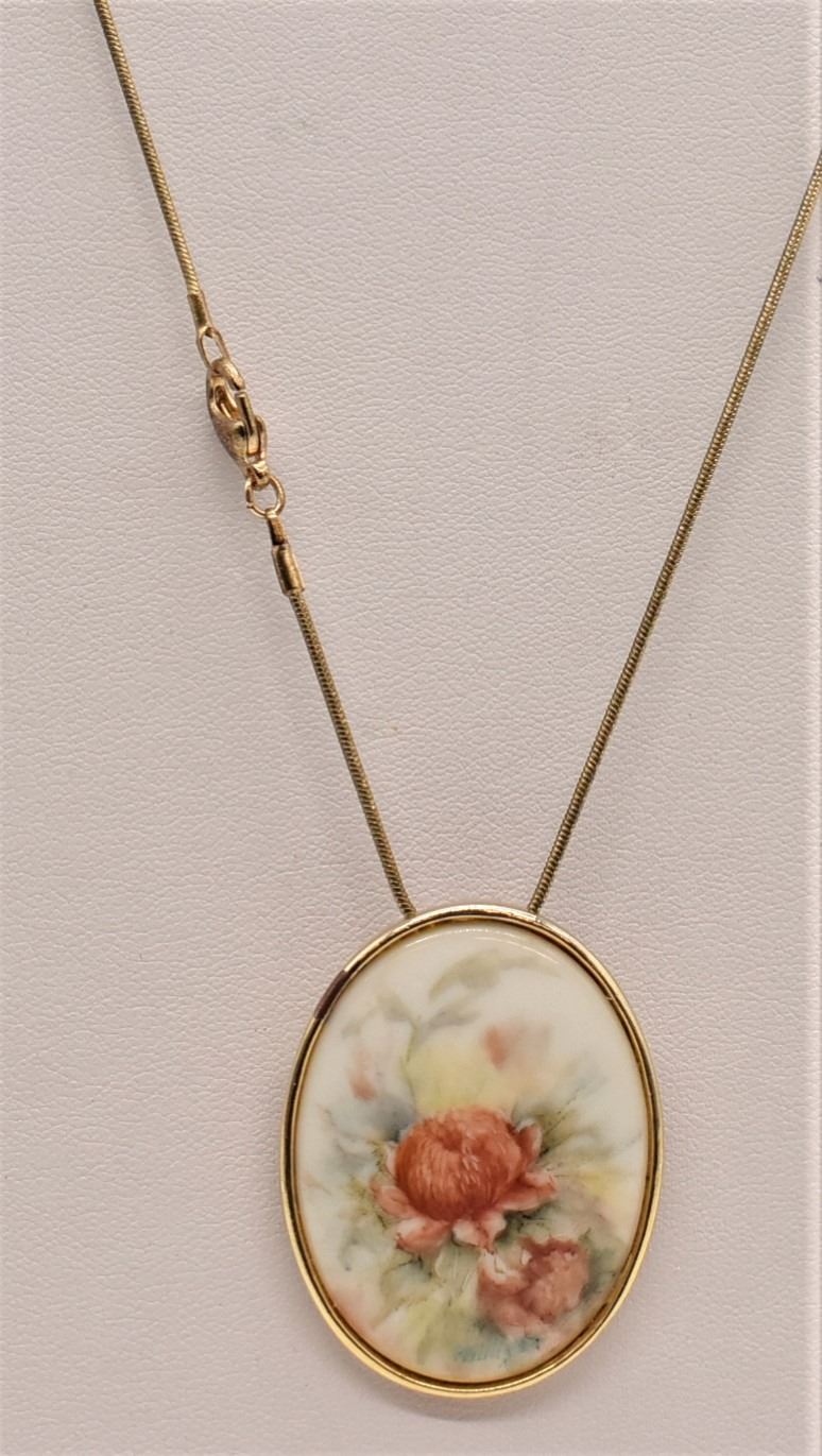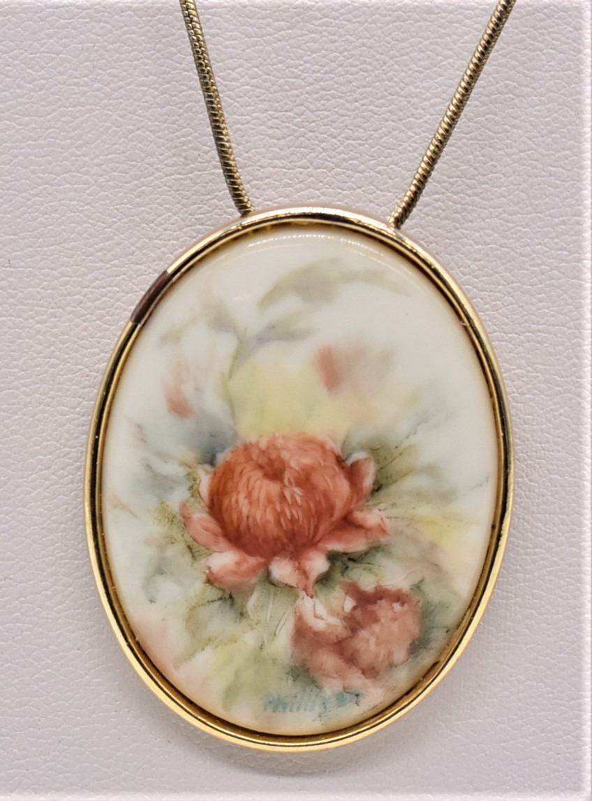 Estate Vintage Hand Painted Porcelain Pin Pendant Necklace, pendant measures 1.75''L x 1.25''W, chain measures 17''L end to end, pendant is signed Phillis '84