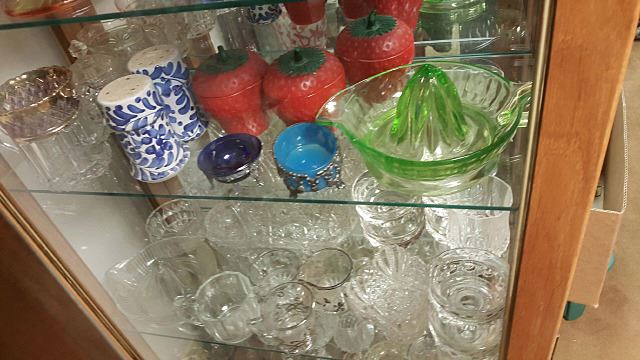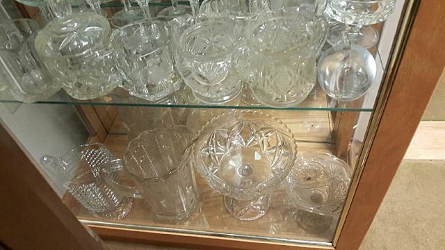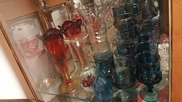 Estate vintage glassware including Carnival Glass, blue glasses, Depressionware, crystal, decanter's, cobalt blue and blue salt cellars, Bohemenian glass pitcher and decanter, etc. all from the farm.
