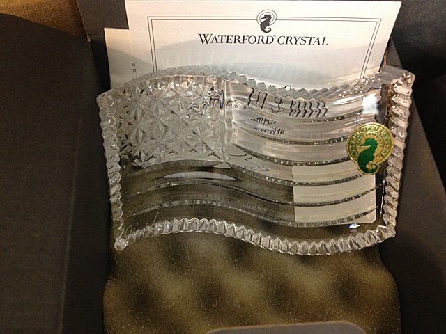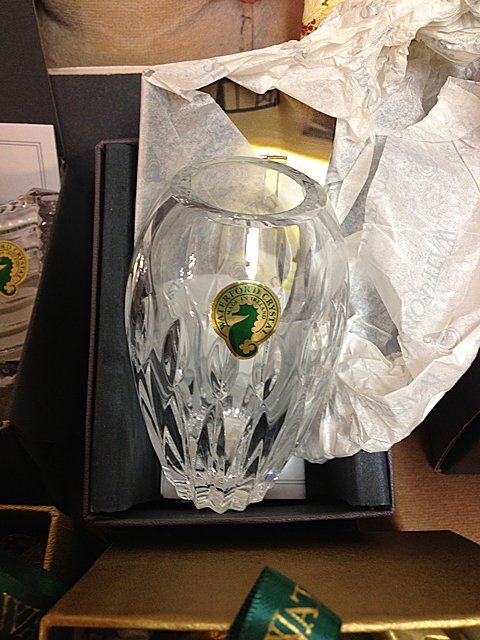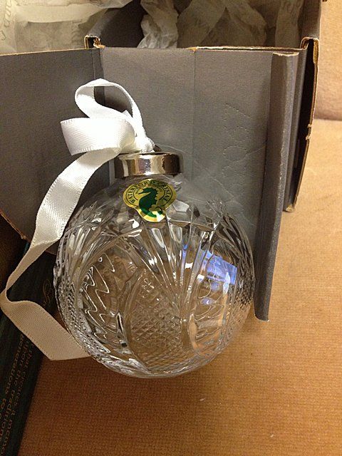 Collection of Waterford Crystal with original boxes. 6 Pieces, including 2 Red, Green and Gold Christmas Ornaments, 2 Times Square Crystal Balls, small bud vase and Crystal American Flag. The Waterford Crystal has a retail value close to $400. Also included is a small pitcher / bud vase is the shape of a face by Rosethall, Germany. A great lot just in time for the Holidays!