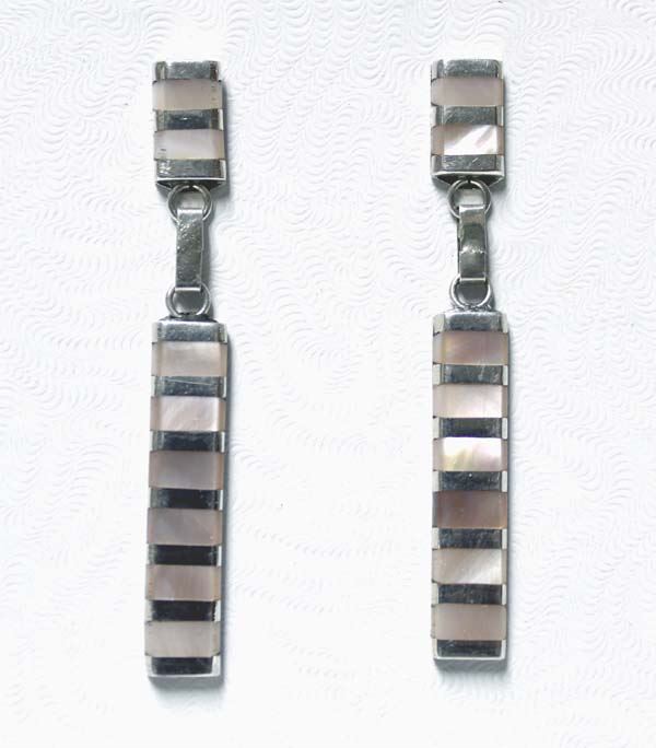 From the Nupp Estate in Silver City NM, we have an Elegant Pair of Native American Zuni Sterling Silver Pink Mother of Pearl Inlay Dangle Earrings, measure 2''L x .5''W, 7.1g in total wt.