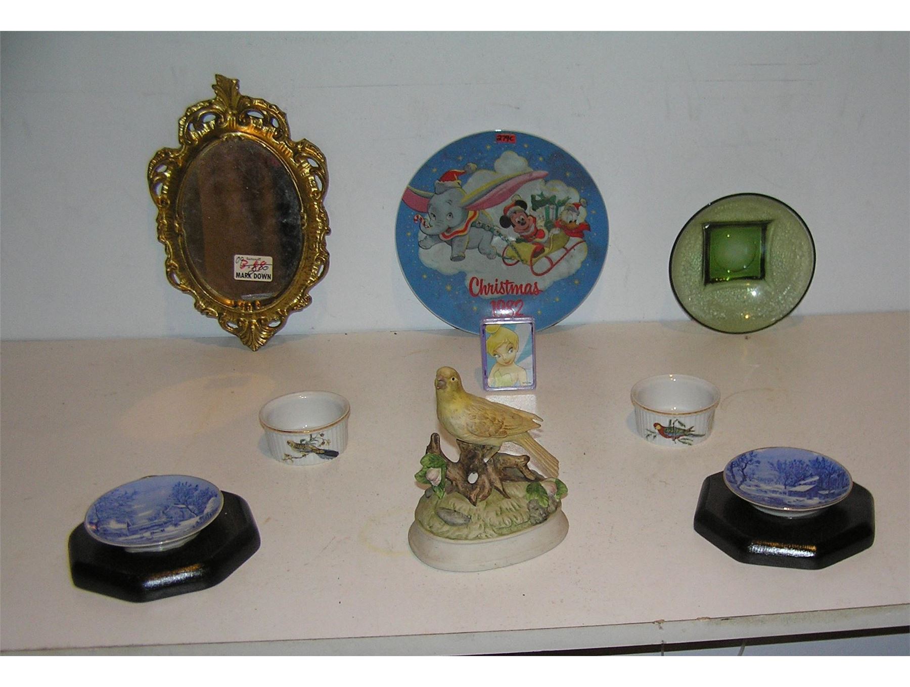 Estate collectibles includes Disney, Fortinoff mirror, French bird decorated porcelain bowls, Currier and Ives style miniature blue decorated plates and a musical bird figurine est. value $75.00-$80.00