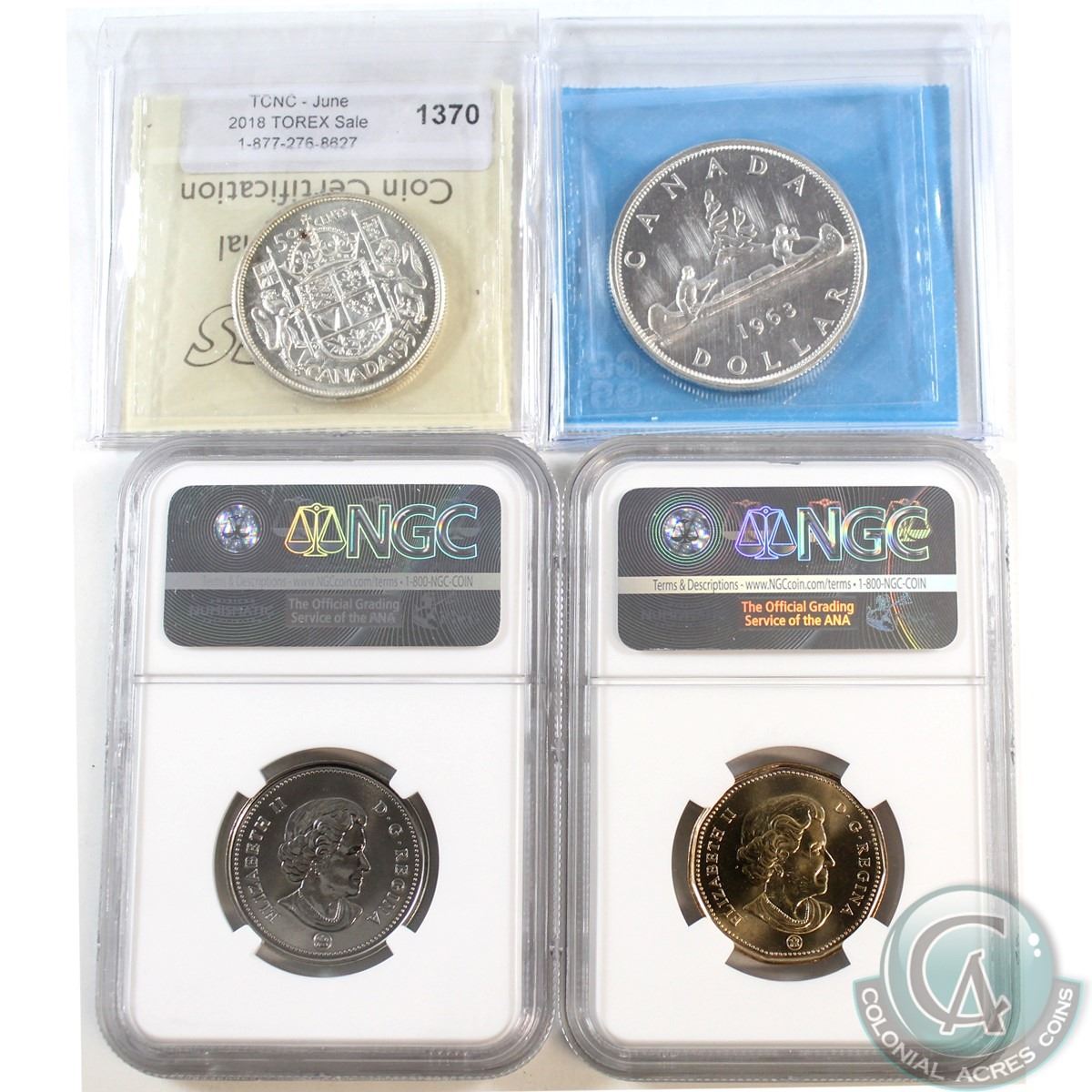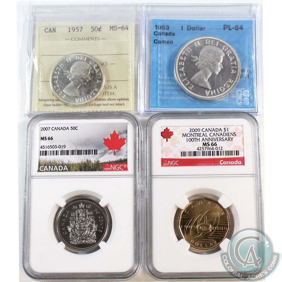 Estate lot Canada 50-cent & Dollar Certified Coins: 1957 ICCS 50-cent MS-64, 2007 50-cent NGC MS-66, 1963 Dollar CCCS PL-64; Cameo & 2009 Montreal Canadiens 100th Anniversary Dollar NGC MS-66. 4pcs