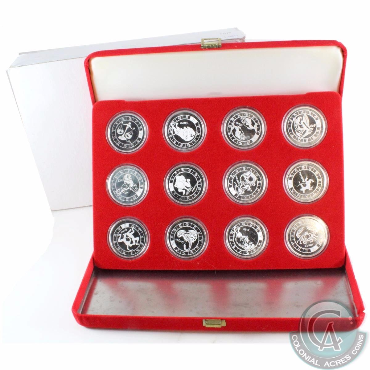 Estate lot of 12 coin set of 1oz .999 Fine Silver Zodiac Rounds in Red velvet Display case. (Tax Exempt) You will receive 12 1oz .999 Fine silver round each depicting the 12 Zodiac Signs on the front ,The reverse displays the month that associated with each symbol and their traits. (i.e. Qualities, symbols, Element and planet).
