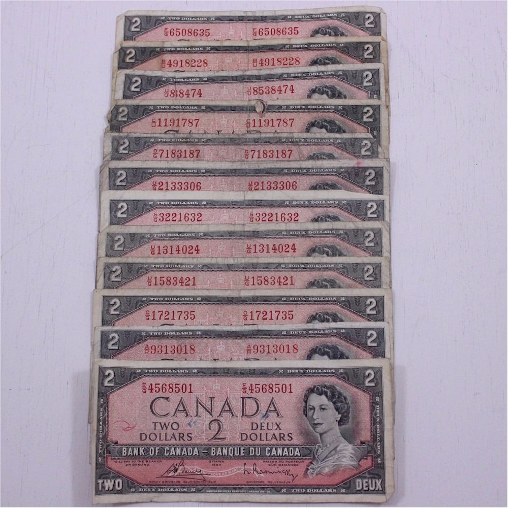 Estate lot of 12 x 1954 $2.00 notes with various signatures.