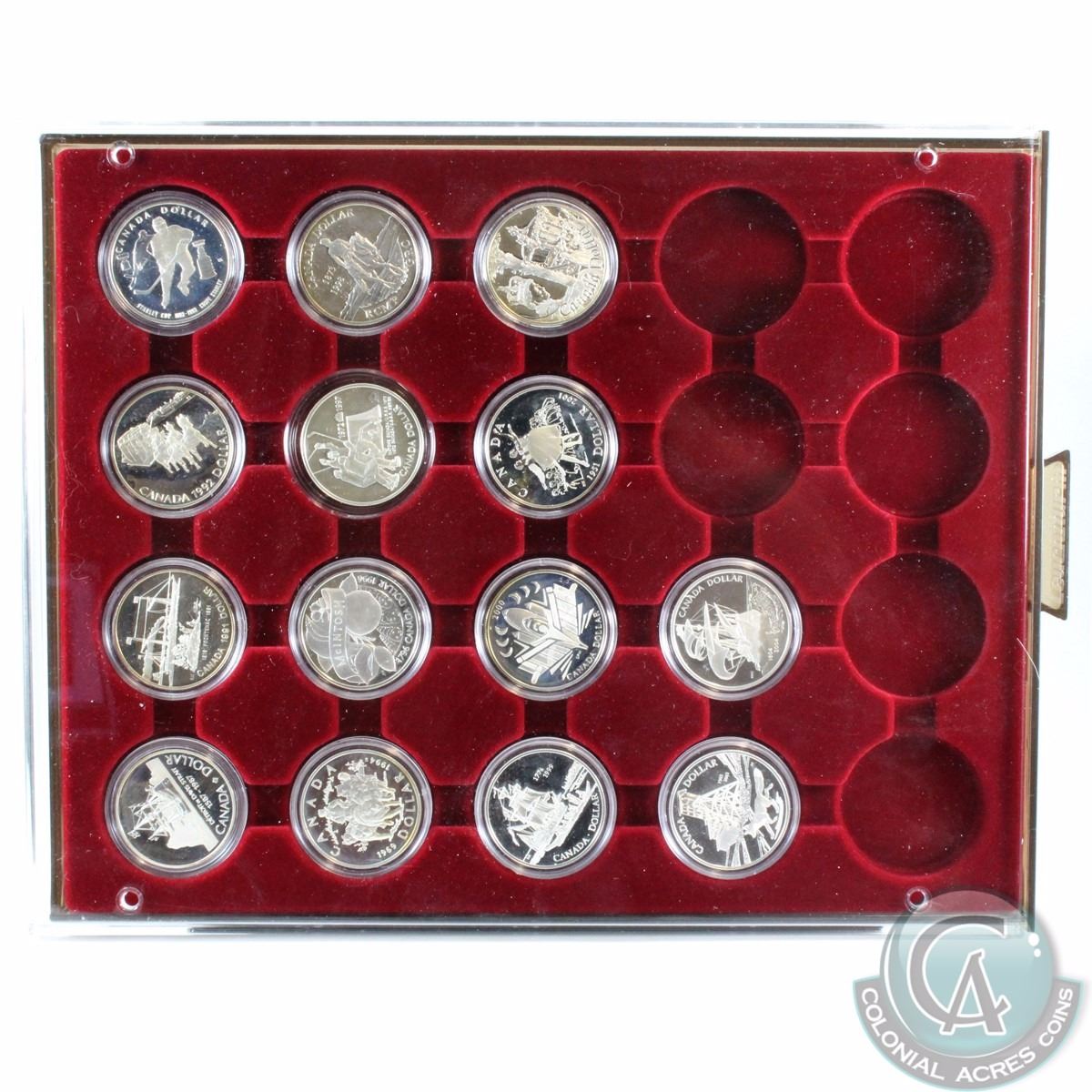 Estate lot of 14x Canada Proof commemorative silver Dollars. This lot includes the following dates of commemorative silver coin: 1987,1991,1992,1993,1994,1996,1997,1998,1999,2000,2001,2002,2003 and 2004. please note some of these coin are toned. There is a total of 9.75oz of pure silver in this lot (14 coin total). sold as is, no returns.