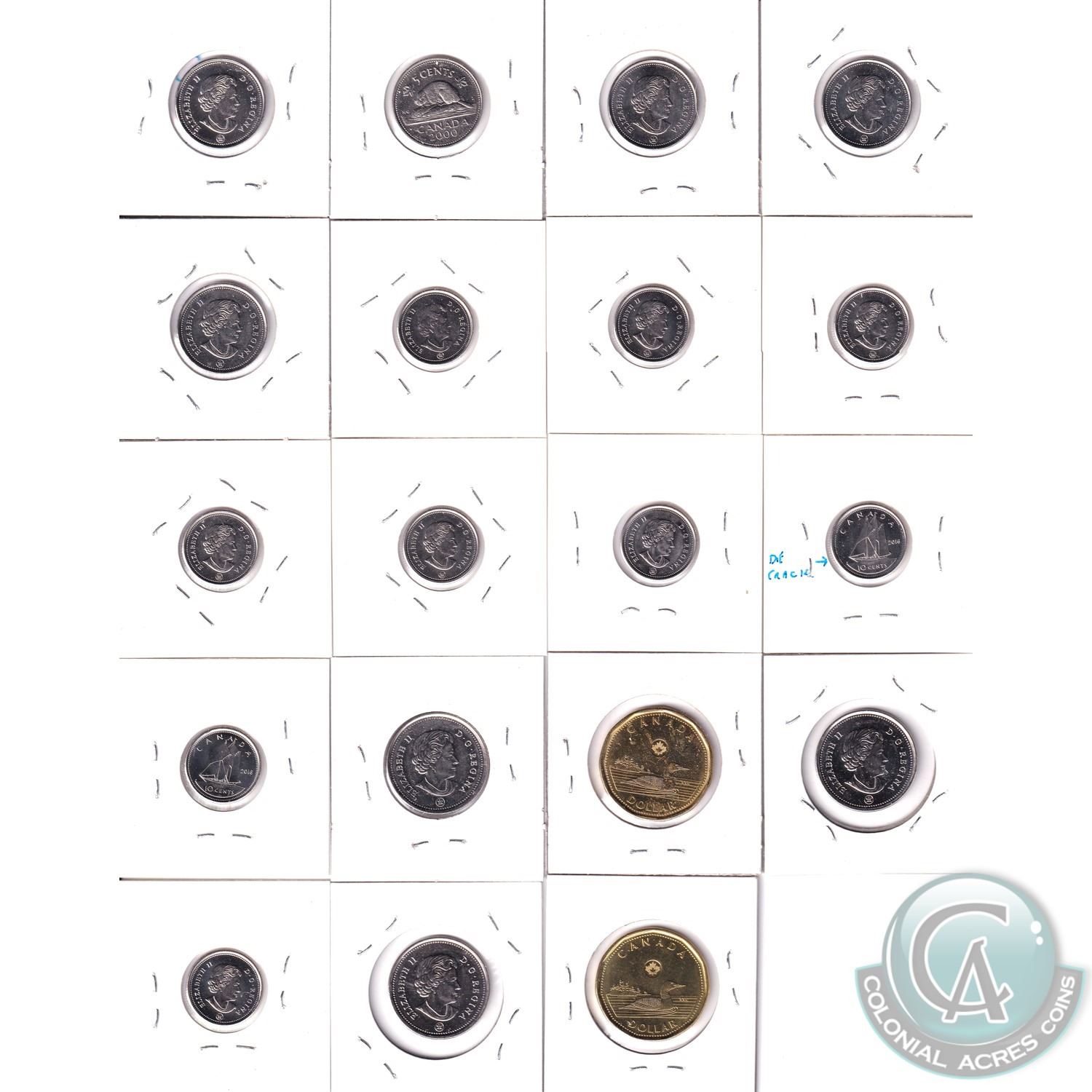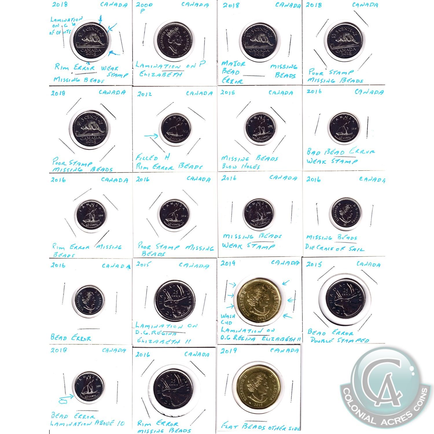 Estate lot of 19x Canada ERROR coins dated between 2000-2019. This lot includes: 5x 5-cents, 9x 10-cent, 4x 25-cent and 1x Dollar coin. 19pcs. Please reference images for exact error and dates.
