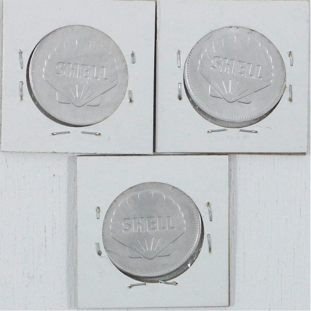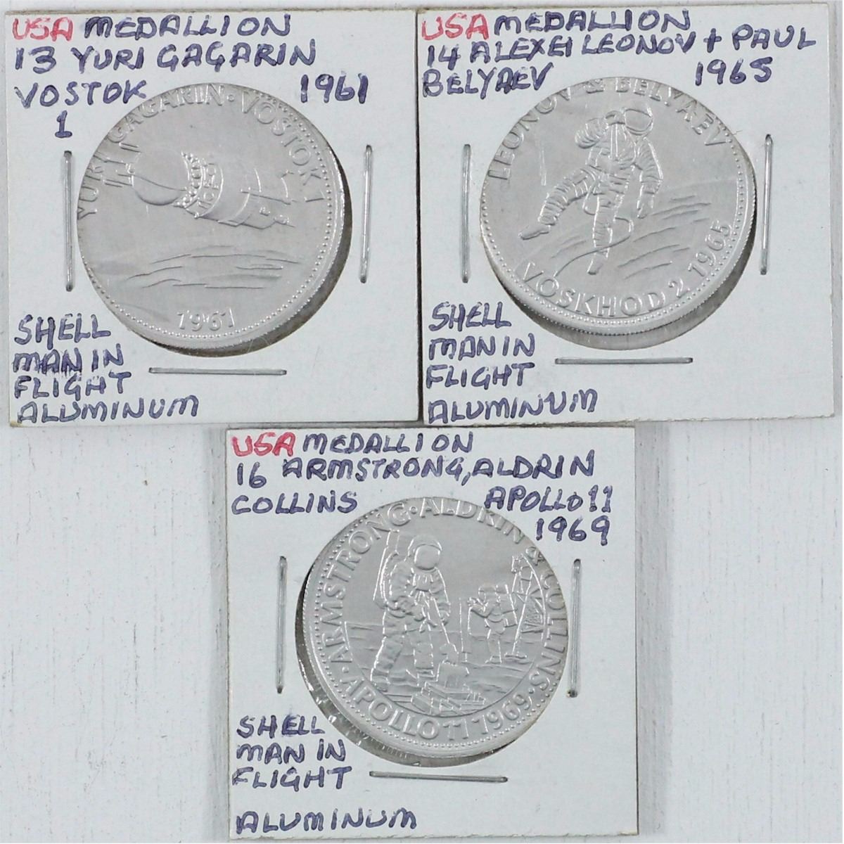 Estate lot of 3x Shell Gas Station Apollo Missions Aluminum Tokens. You will receive a 1961 Apollo 13 Yuri Gagarin Vostok 1 Token, 1965 Apollo 14 Alexei Leonov & Paul Belyaev and 1969 Apollo 16 Armstrong, Aldrin & Collins Aluminum Token.