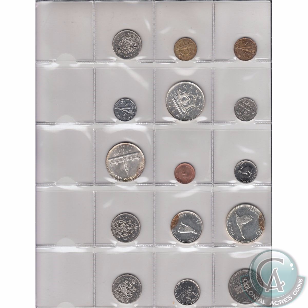 Estate lot of 65x 1935-2001 Canadian Commemorative coins in white display folder. This lot includes : you will receive 3x 1-cents dated 1967,1992 and 2001, 6x 5-cents: 1942,1943,1945,1951, 1967, and 1992,2x 10-cents: 1992 and 2001, 36x 25-cents: 1973 RCMP, 1992 NB, 1992 NWT, 1992 NFLD, 1992 MB, 1992 YK, 1992 AB, 1992 PEI, 1992 ONT, 1992 NS, 1992 QC, 1992 SK, 1992 BC, 1999 January, 1999 FEB, 1999 March, 1999 April, 1999 May, 1999 June, 1999 July, 1999 August, 1999 Sept, 1999 Oct, 1999 November, 1999 December, 2000 Pride, 2000 Ingenuity, 2000 Achievement, 2000 Health, 2000 natural legacy, 2000 freedom, 2000 celebration, 2000 family, 2000 wisdom, 2000 creativity, and 2000 freedom. 7x 50-cents; 1967, 3x 1969, 1970,1979,and 1992, 10x Canada dollars: 1939 silver ,1949 silver,1967 Silver, 1973,1982 constitution,1984 cartier,1992 double date, 1992 parliament,1994 memorial loon, and 1995 peacekeeping loon 2x $2: 1999 Nunavut and 2000 Knowledge.