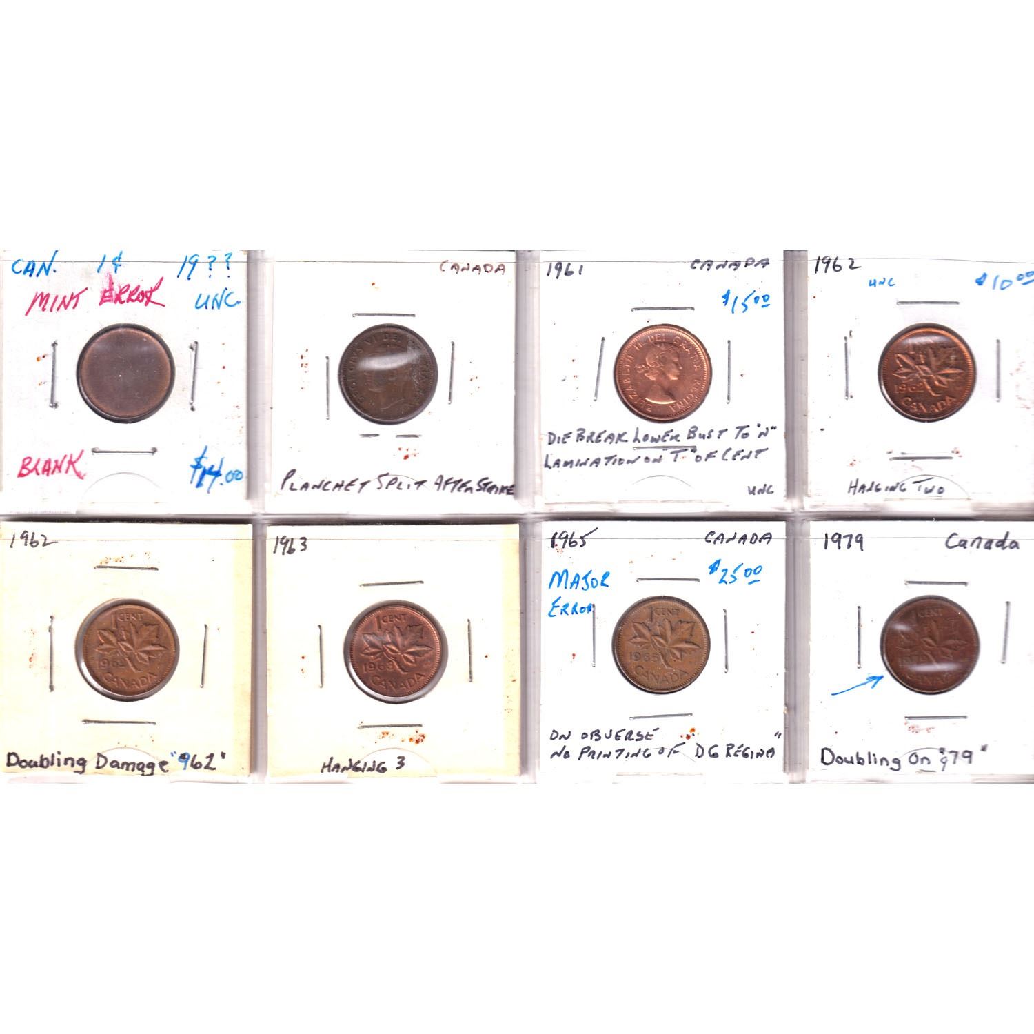 Estate lot of 8x Canada 1-cent Errors and Varieties . Lot includes a 1-cent blank planchet, hanging 3 and more varieties. 8pcs