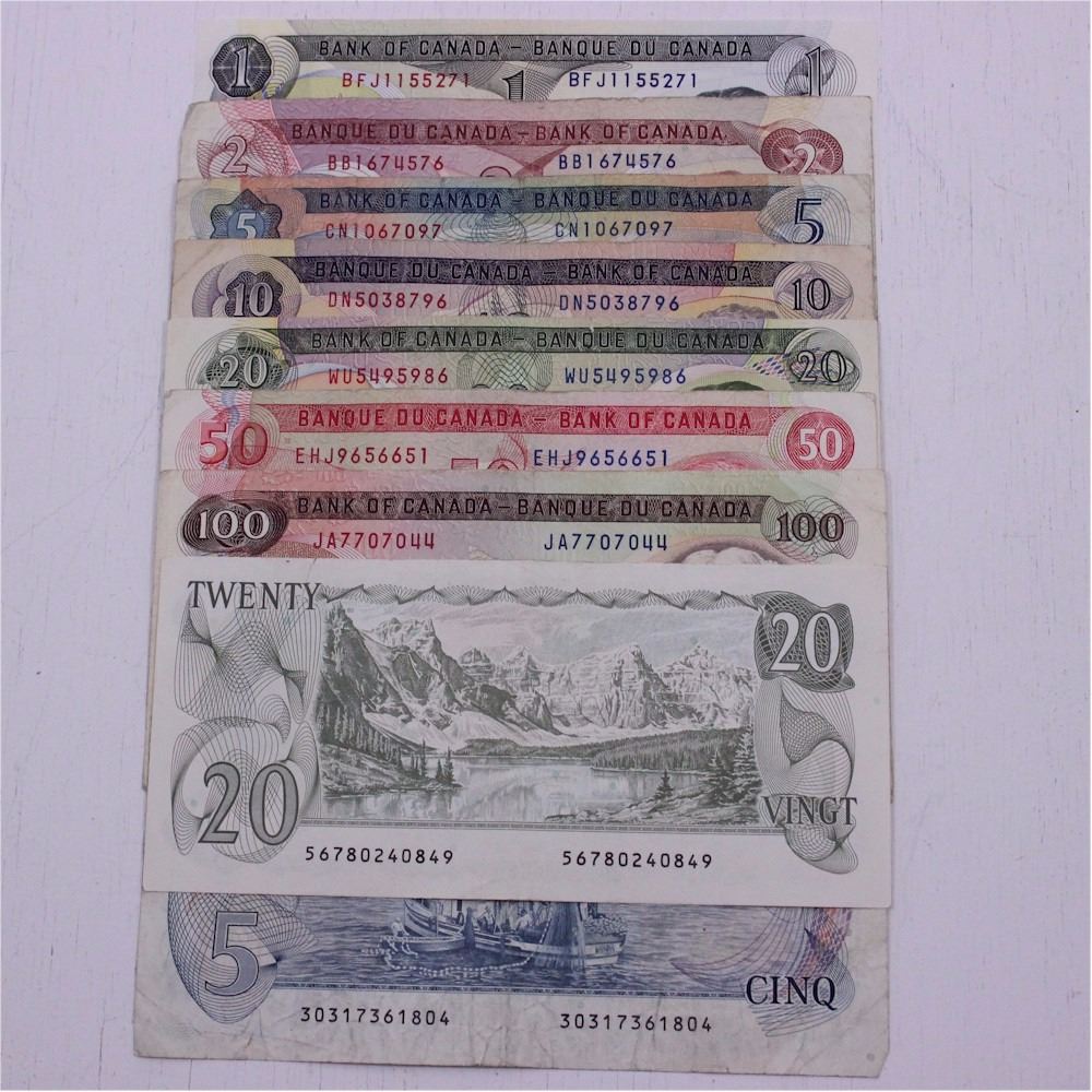 Estate lot of 9 notes from the 1970's Multicoloured Series in the following denominations; $1, $2, $5, $10, $20, $50, $100, 1979 $5 and 1979 $20.