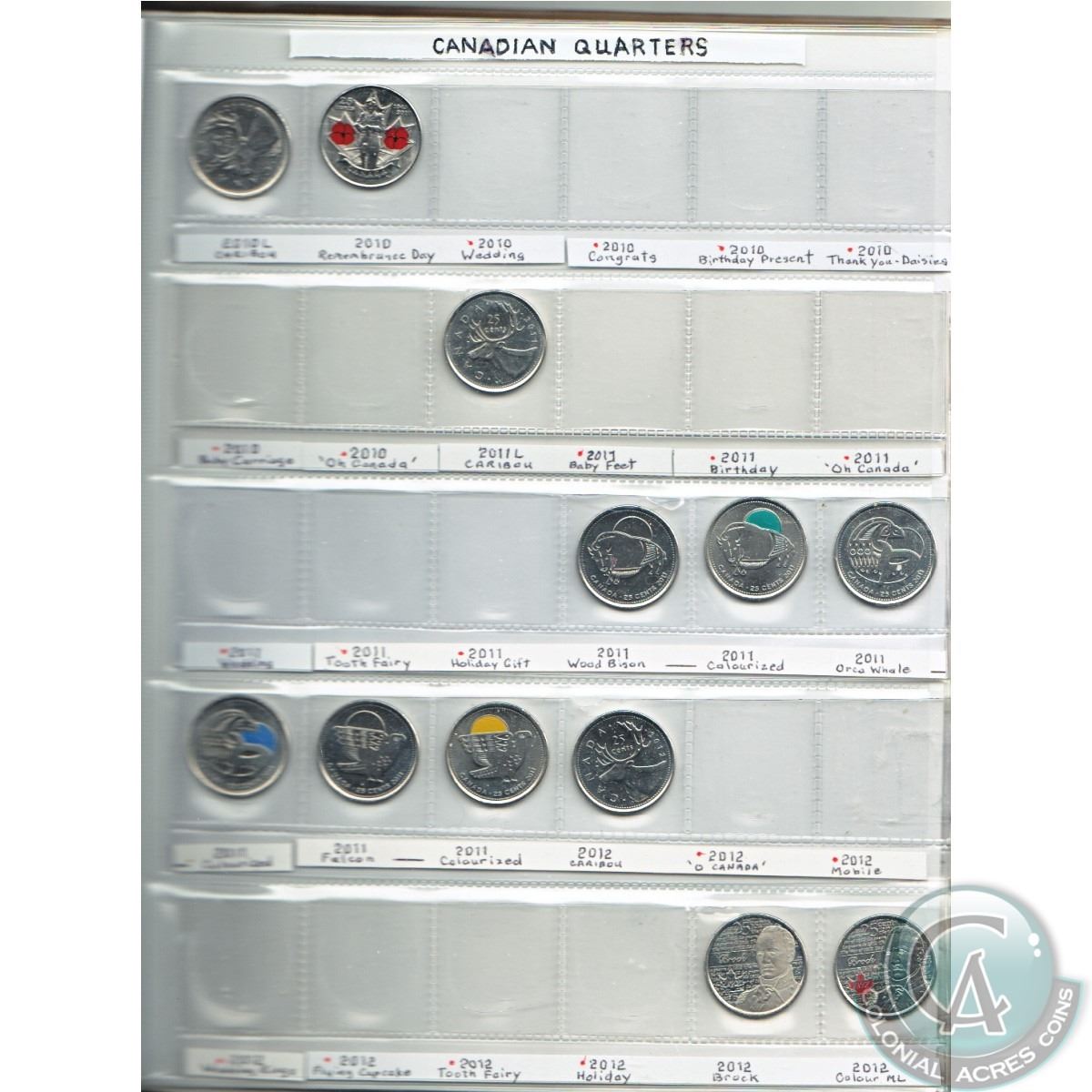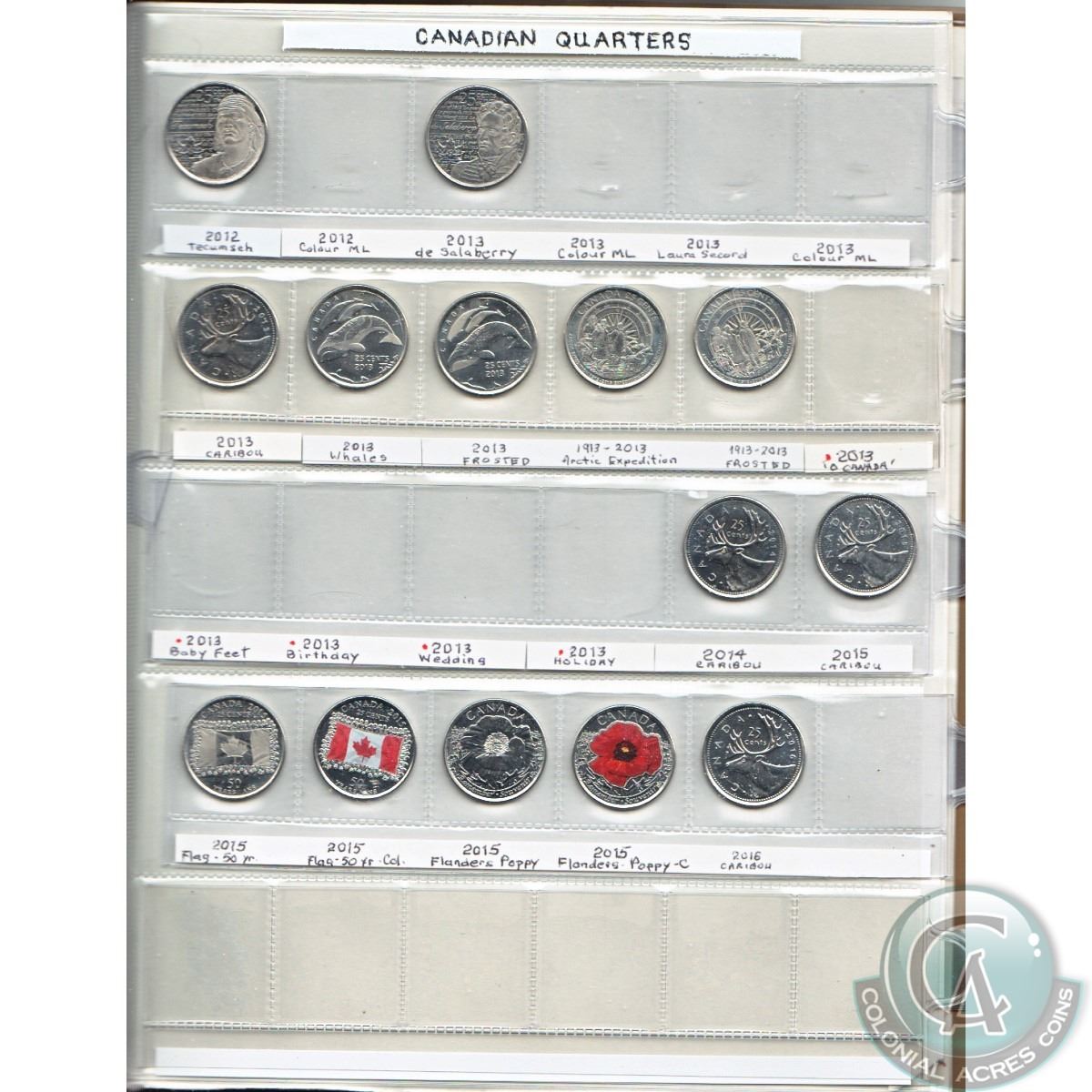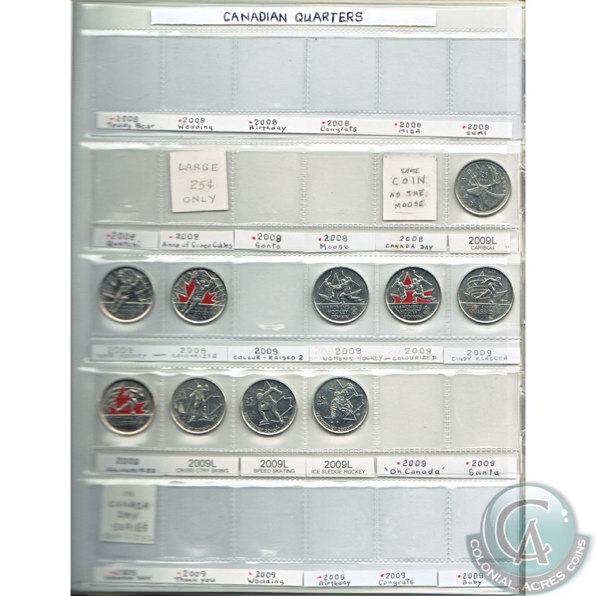 Estate lot of Canada 25cts from 2000 to 2016, most coins are commemorative, some are coloured. Comes in a brown folder and also includes the 2000 Moose 25ct plus many other commemoratives. 72pcs.