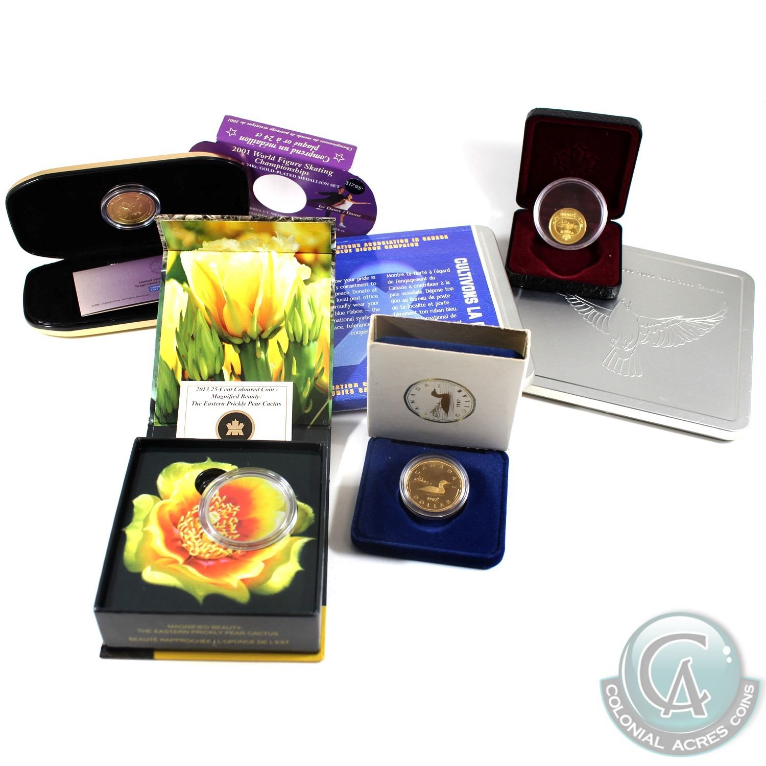 Estate lot of Canada Commemorative coins: 1987 Proof Loon with display box, 2001 3-cent coin in capsule, 2001 figure skating world champing ship stamp and medallion set, 2x 2000 Canada post Millennium official keepsake with Dove token and stamps & 2013 Canada 25-cent Magnified beauty-the eastern prickly pear cactus. 6pcs