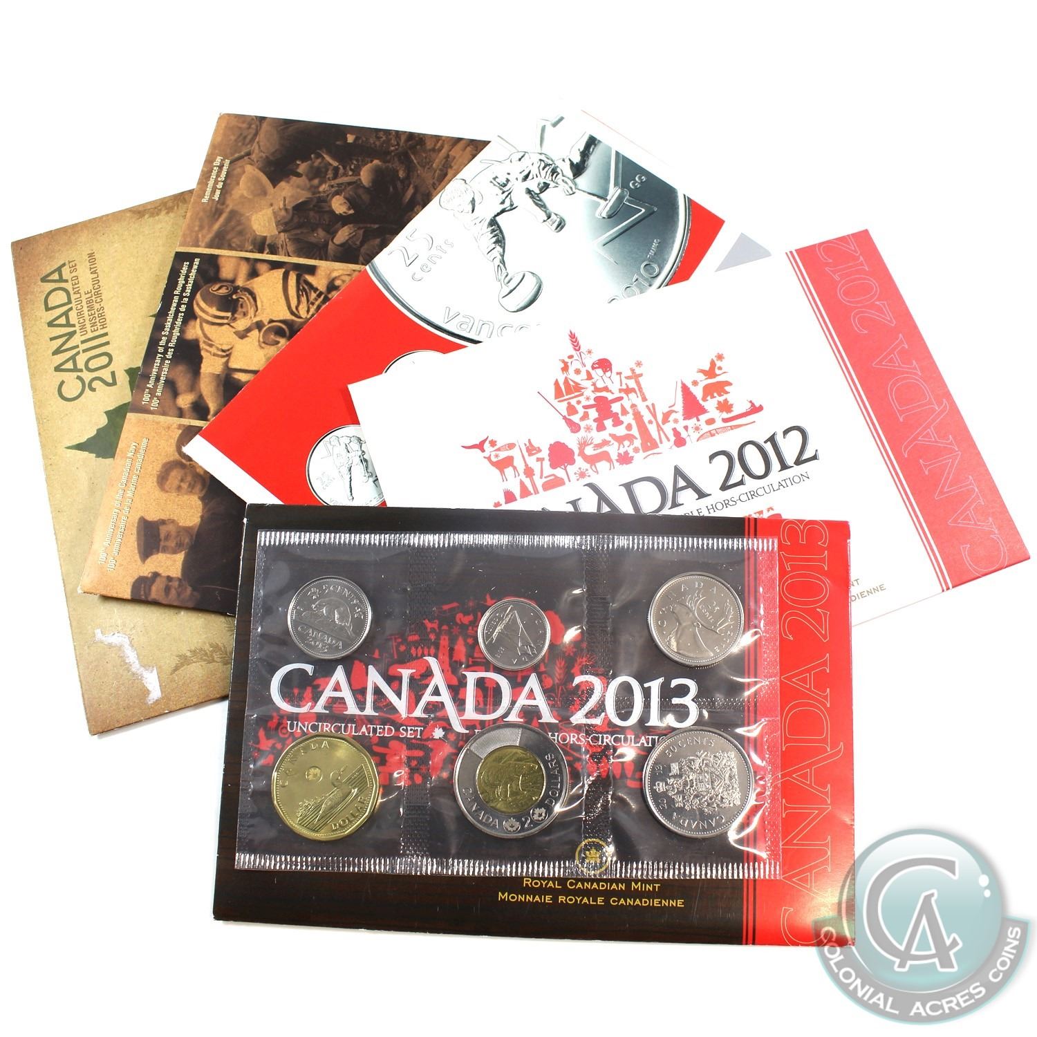 Estate lot of Canada Proof-like Uncirculated sets. This lot includes: 2007 Special Edition Vancouver Olympics, 2010 Special Edition, 2011, 2012 & 2013(some sets contain minor imperfections. 5 sets.