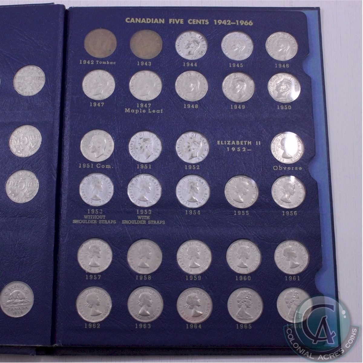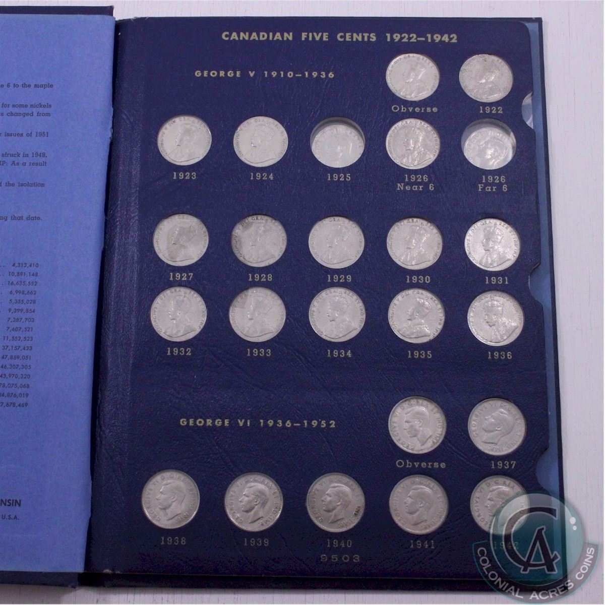 Estate lot of Canadian Nickel Dated from 1922-1966 in Blue Whitman Folder. This lot includes the following dates: 1922, 1923,1924, 1926, 1927,1928,1929,1930,1931, 1932,1933, 1934,1935,1936, 1937 dot, 1938,1939, 1940, 1941,2x 1942,1942 tombac, 1943 tombac, 1944 chrome, 1945, 1946, 1947, 1947 ML, 1948,1949,1950,1951 refinery, 1951, 1952,2x 1953, 1954,1955, 2x 1956, 1957,1958,1959,1960,1961,1962,1963,1964,1965 and 1966. ( 51 coins total) please view scan. No return.