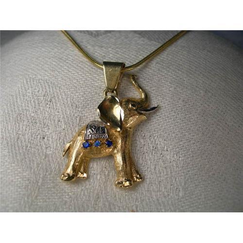You are looking at an estate 14K two-tone gold elephant pendant. The piece features 3 natural sapphires at the back of the elephant. The pendant measures just under 1.5 inches long by one inch wide. It weighs 5.4 grams. It is in mint condition.