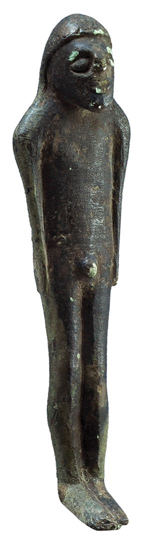 Estatuilla de un Kuros. Período Arcaico (siglos VII-VI a.C.). Bronce. Altura 9,0 cm. Colección privada norteamericana, adquirida en la galería Royal-Athena de Nueva York en 1989. Incluye peana.