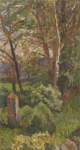 <B>Estella Frances Solomons HRHA (1882-1968)</B><BR>RATHFARNHAM WOODS<BR>signed lower left; with the framing label of the Dawson Gallery, Dublin, on reverse<BR>oil on canvas<BR>56 by 30cm., 22 by 12in.<BR>Provenance:<BR>Dr Michael Solomons, the artist's nephew; From whom purchased circa late 1960s for £50 by the father of the present owner Exhibited: 'Estella Solomons', 42 Fitzwilliam Square, Dublin, private exhibition in aid of CORA (Committee of Refugee Aid), circa 1960s
