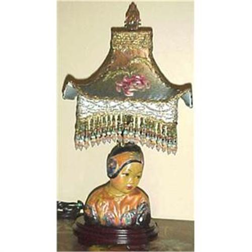 Beautiful 1920s Lotus Bud bust by artist Esther Hunt with a customized Pagoda shade covered in hand dyed silk with antique Chinese silk floral appliques and black and gold lace. The shade is handmade by Florida artist Christine Kilger.
