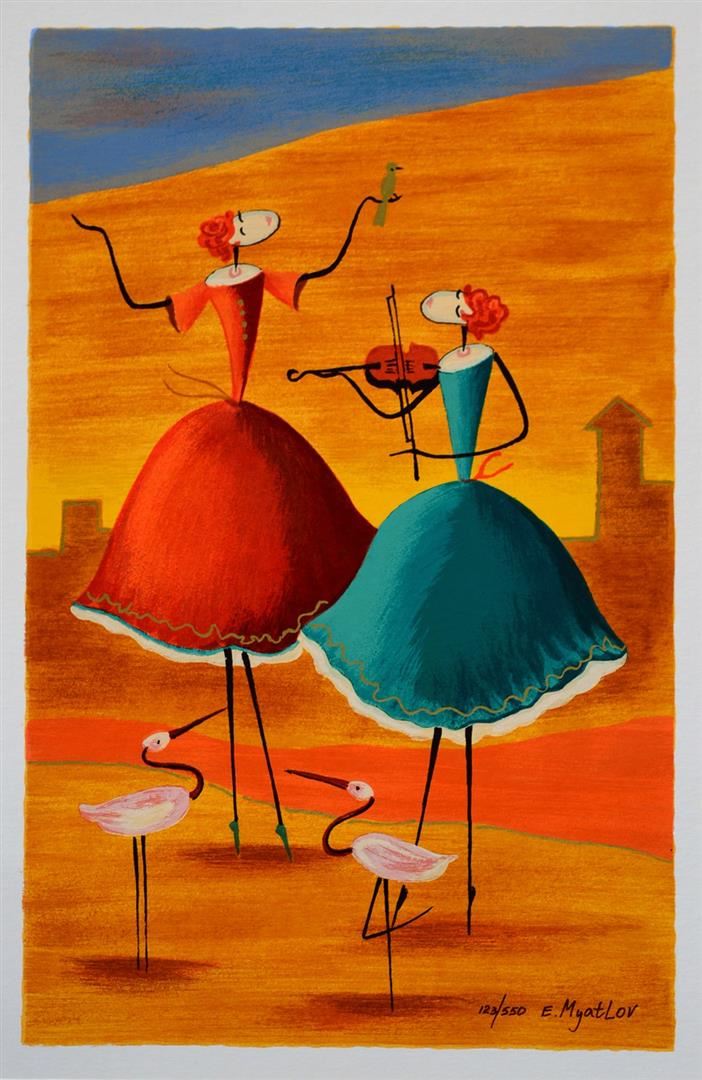 Artist: Esther Myatlov - Title: A Day to Remember - Medium: Serigraph on Fine Art Paper - Signature: Hand-signed by the Artist - Limited Edition: 550 - Paper Size: Approximately 13.75 inches x 8.75 inches - Framed: Unframed - Details: This work comes with a Certificate of Authenticity - Esther Myatlov Achieves A Strong Illumination Of The Painting From Deep Within. She Then Uses Fiery Colors And Unambiguous Contours To Convey A Joyous Atmosphere, With An Ethnic-mythological Flavor.