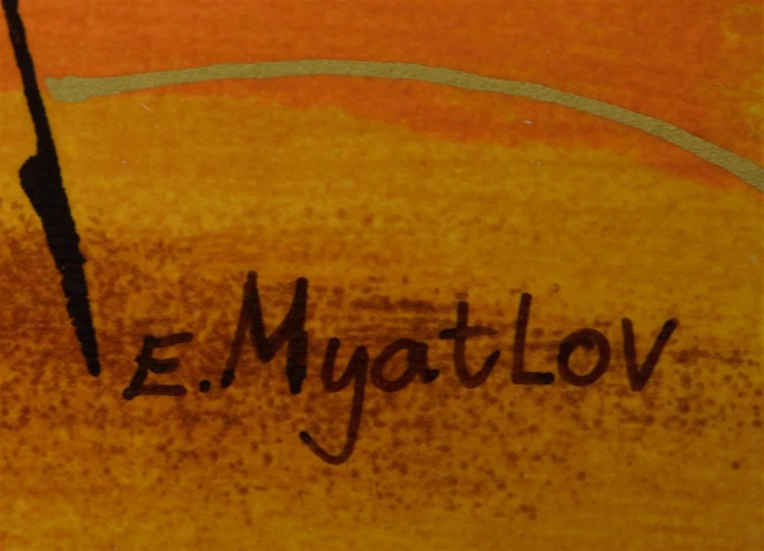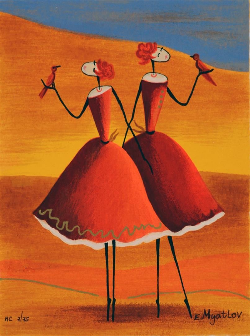Artist: Esther Myatlov - Title: Chance Meeting - Medium: Serigraph on Fine Art Paper - Signature: Hand-signed by the Artist - Limited Edition: HC 75 - Paper Size: Approximately 8.75 inches x 6.75 inches - Framed: Unframed - Details: This work comes with a Certificate of Authenticity - Esther Myatlov Achieves A Strong Illumination Of The Painting From Deep Within. She Then Uses Fiery Colors And Unambiguous Contours To Convey A Joyous Atmosphere, With An Ethnic-mythological Flavor.
