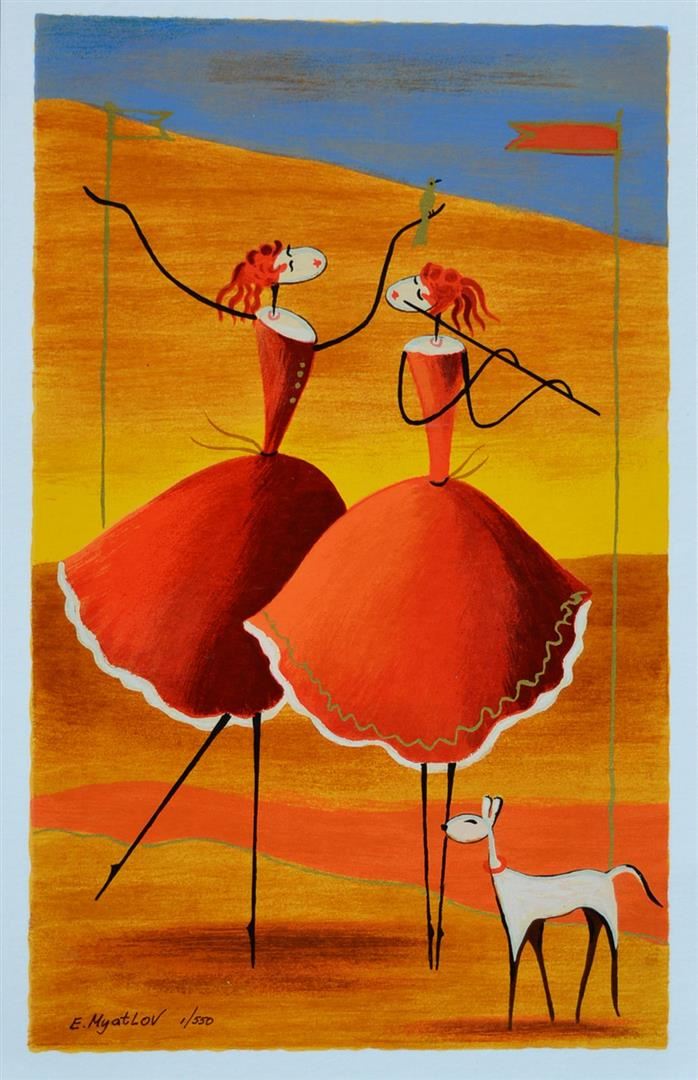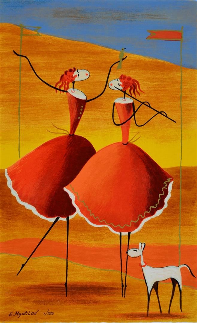 Artist: Esther Myatlov - Title: Enchanted - Medium: Serigraph on Fine Art Paper - Signature: Hand-signed by the Artist - Limited Edition: 550 - Paper Size: Approximately 13.75 inches x 8.75 inches - Framed: Unframed - Details: This work comes with a Certificate of Authenticity - Esther Myatlov Achieves A Strong Illumination Of The Painting From Deep Within. She Then Uses Fiery Colors And Unambiguous Contours To Convey A Joyous Atmosphere, With An Ethnic-mythological Flavor.