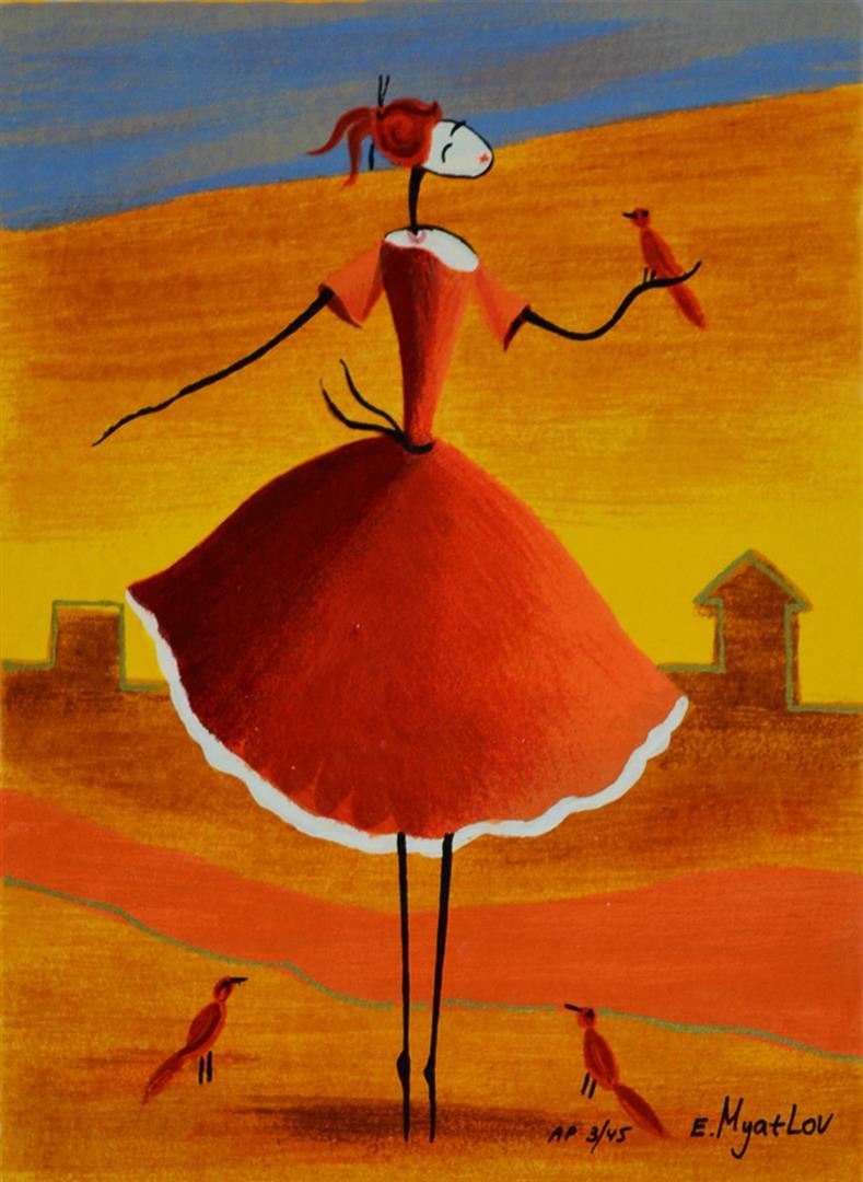 Artist: Esther Myatlov - Title: Especially for You - Medium: Serigraph on Fine Art Paper - Signature: Hand-signed by the Artist - Limited Edition: AP 45 - Paper Size: Approximately 8.75 inches x 6.75 inches - Framed: Unframed - Details: This work comes with a Certificate of Authenticity - Esther Myatlov Achieves A Strong Illumination Of The Painting From Deep Within. She Then Uses Fiery Colors And Unambiguous Contours To Convey A Joyous Atmosphere, With An Ethnic-mythological Flavor.