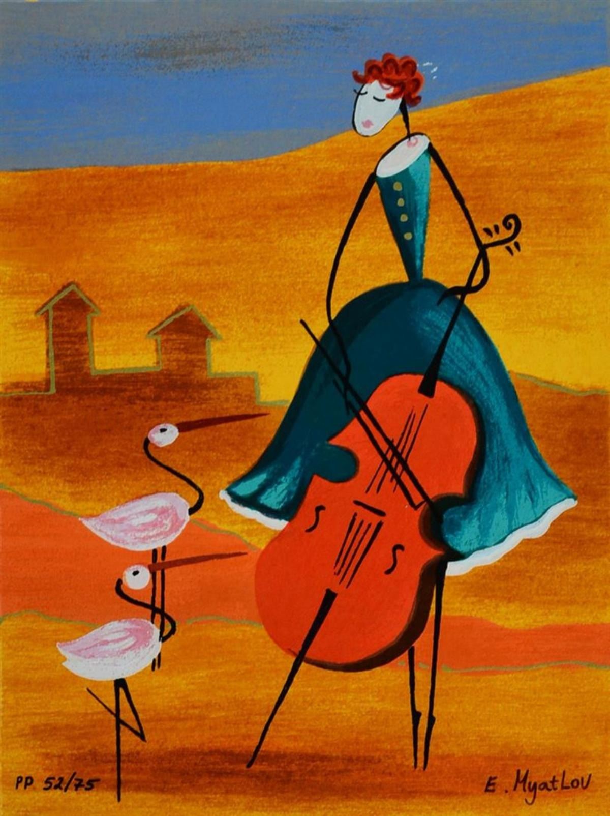 Artist: Esther Myatlov - Title: Magical Tune - Medium: Serigraph on Fine Art Paper - Signature: Hand-signed by the Artist - Limited Edition: PP 75 - Paper Size: Approximately 8.75 inches x 6.75 inches - Unframed - Details: This work comes with a Certificate of Authenticity - Esther Myatlov Achieves A Strong Illumination Of The Painting From Deep Within. She Then Uses Fiery Colors And Unambiguous Contours To Convey A Joyous Atmosphere, With An Ethnic-mythological Flavor.