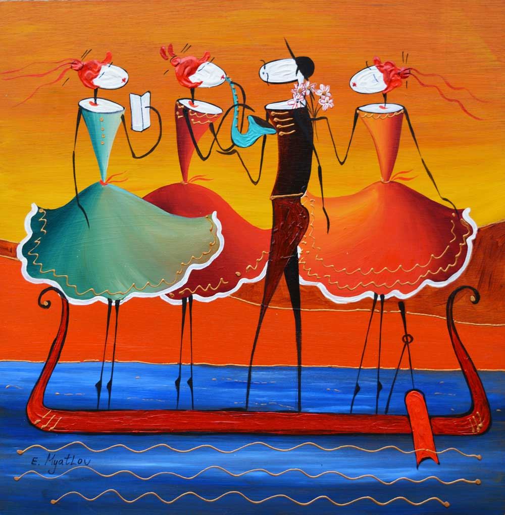 Artist: Esther Myatlov (b. 1976) - Title: Friends on a Gondola - Medium: Original Oil on Wood - Signature: This one-of-a-kind work is hand-signed by the artist at the bottom of the image - Image Size: Approximately 12 inches x 12 inches - Unframed - Details: This work comes with a Certificate of Authenticity - Biography: Esther Myatlov was born in Russia in 1976, where she graduated the 'School of Fine Arts' in her hometown. In 1995, she immigrated to Israel and continued her art studies at the "Avni Institute of Art" in Tel Aviv. During her studies, she experimented with classical Russian art and with contemporary Israeli art and fused them together to create her unique style. Among others, she has been influenced by the notable French painter Ona. She also mastered the art of animation and she has created numerous animated video clips for rock bands. Myatlov's artwork is exhibited in many private collections in the United States, Russia and Israel. Her large murals are to be found in several public buildings in Israel, and her solo exhibitions have had considerable success with the public and the media.