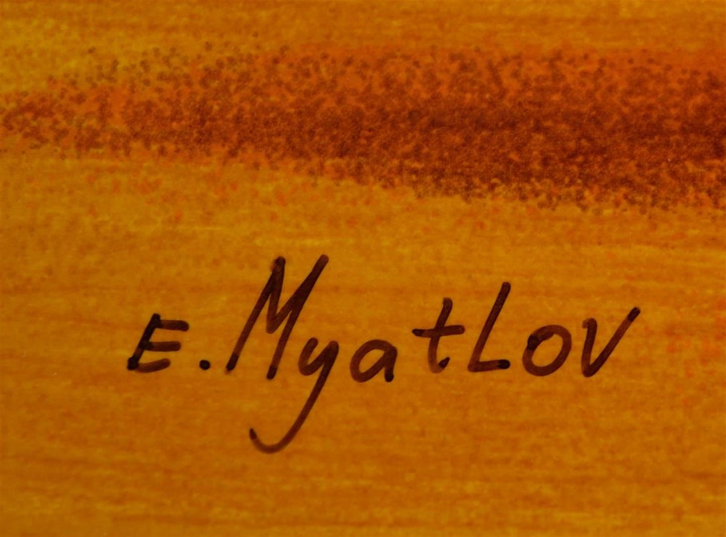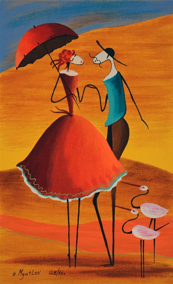 Artist:  Esther Myatlov - Title:  Serenade - Medium: Serigraph on Fine Art Paper - Signature: Hand-signed by the Artist - Limited Edition: 550 - Paper Size: Approximately 13.75 inches x 8.75 inches  - Framed: Unframed - Details: This work comes with a Certificate of Authenticity - Esther Myatlov Achieves A Strong Illumination Of The Painting From Deep Within. She Then Uses Fiery Colors And Unambiguous Contours To Convey A Joyous Atmosphere, With An Ethnic-mythological Flavor.