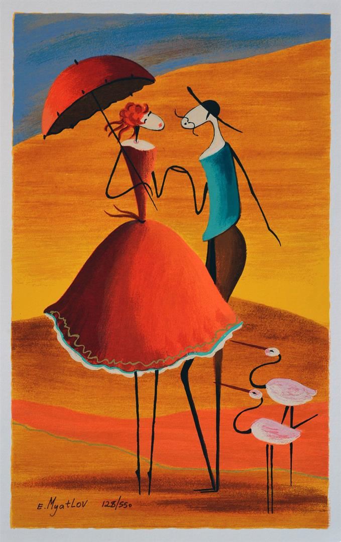 Artist: Esther Myatlov - Title: Serenade - Medium: Serigraph on Fine Art Paper - Signature: Hand-signed by the Artist - Limited Edition: 550 - Paper Size: Approximately 13.75 inches x 8.75 inches - Framed: Unframed - Details: This work comes with a Certificate of Authenticity - Esther Myatlov Achieves A Strong Illumination Of The Painting From Deep Within. She Then Uses Fiery Colors And Unambiguous Contours To Convey A Joyous Atmosphere, With An Ethnic-mythological Flavor.