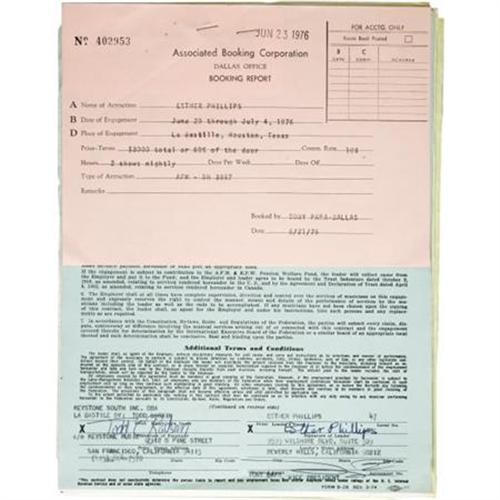 <B>Esther Phillips Signed Contract.</B></I> A booking contract dated June 23, 1976, engaging the singer for a performance in Houston, Texas, signed by her in blue ink. In Very Fine condition.<BR><BR><b>Shipping:</b> Flat Material, Small (<a target="_blank" href="http://www.heritageauctions.com/common/shipping.php">view shipping information</a>)
