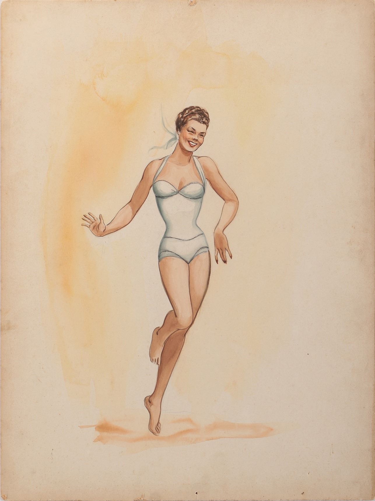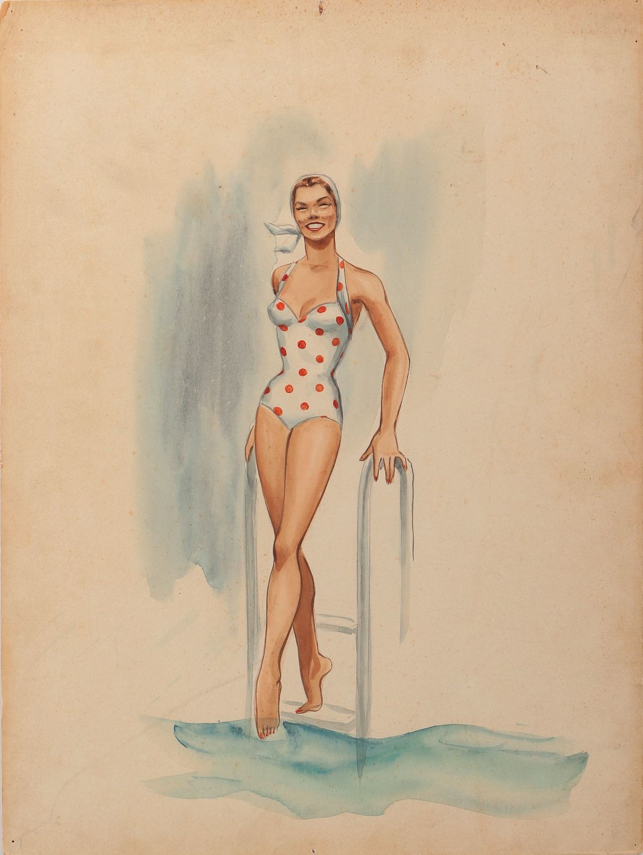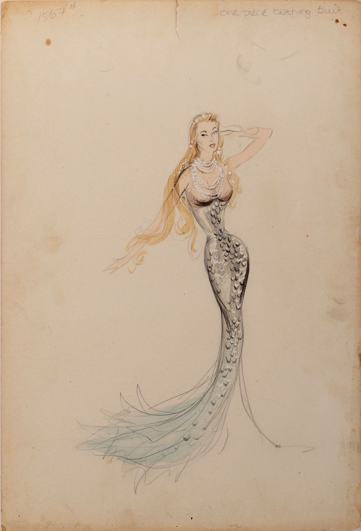 168. Esther Williams (3) swimsuit and mermaid sketches with 1-attributed to designers Kay Dean and Irene for The Thrill of a Romance. (MGM, 1962) Vintage original (3) sketches accomplished in pencil, ink and artists board ranging in size from 15 x 20 in. to 15 x 22 in. Including 1-Esther Williams "Cynthia Glen", 1-Esther Williams red polka dot swimsuit and 1-possible Esther Williams as "Mermaid". Unsigned. Exhibiting production handling, age and wear, with 1-inch tear to the top of the mermaid sketch, not affecting art. In vintage very good to fine condition. $300 - $500