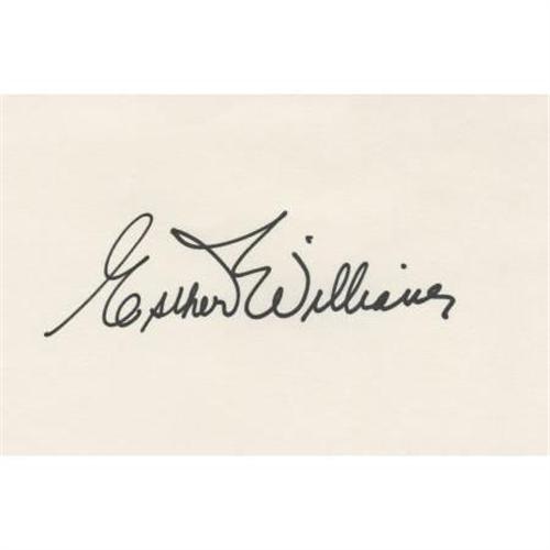 <B>Esther Williams Autograph.</B></I> A 6" x 4" card signed by "America's Mermaid" in black ink. The signature extends across the length of the card and is large and clean. In Excellent condition.<BR><BR><b>Shipping:</b> Flat Material, Small (<a target="_blank" href="http://www.heritageauctions.com/common/shipping.php">view shipping information</a>)