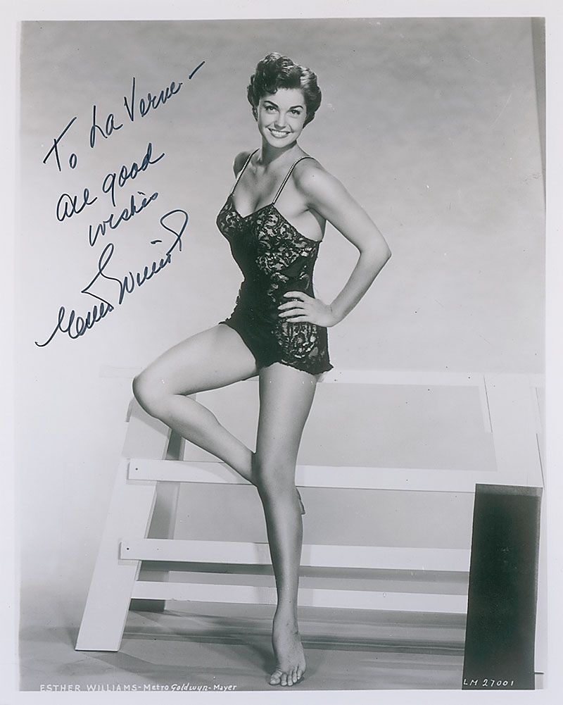 Revealing glossy 8 x 10 full-length photo of Williams, signed and inscribed in black felt tip, “To LaVerne—All good wishes, Esther Williams.” In fine condition.