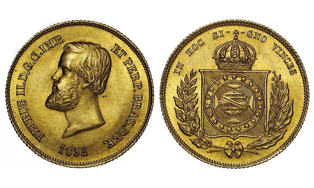 Ouro 5 000 Reis 1854 coroa pérolas BELA