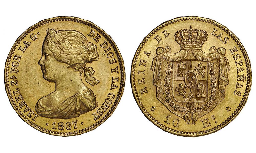 Ouro 10 Escudos 1867 Madrid quase BELA