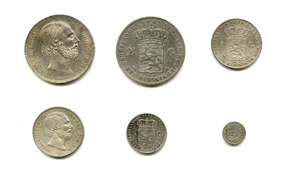 Willem III (1849-1890) - 2 1/2 Gulden 1867, 1869, 1870, 1872, 1873 (x2) (KM 82); 1 Gulden 1854, 1855 (x2), 1858, 1860, 1861, 1863, 1864, 1865 (KM 93); 1/2 Gulden 1858, 1861, 1863 (KM 92); 5 Cents 1863 (KM 91); 2 1/2 Cents 1877, 1884, 1890 (KM 108); 1 Cent 1878, 1880, 1883 (KM 107); 1 Cent 1863 (KM 100)