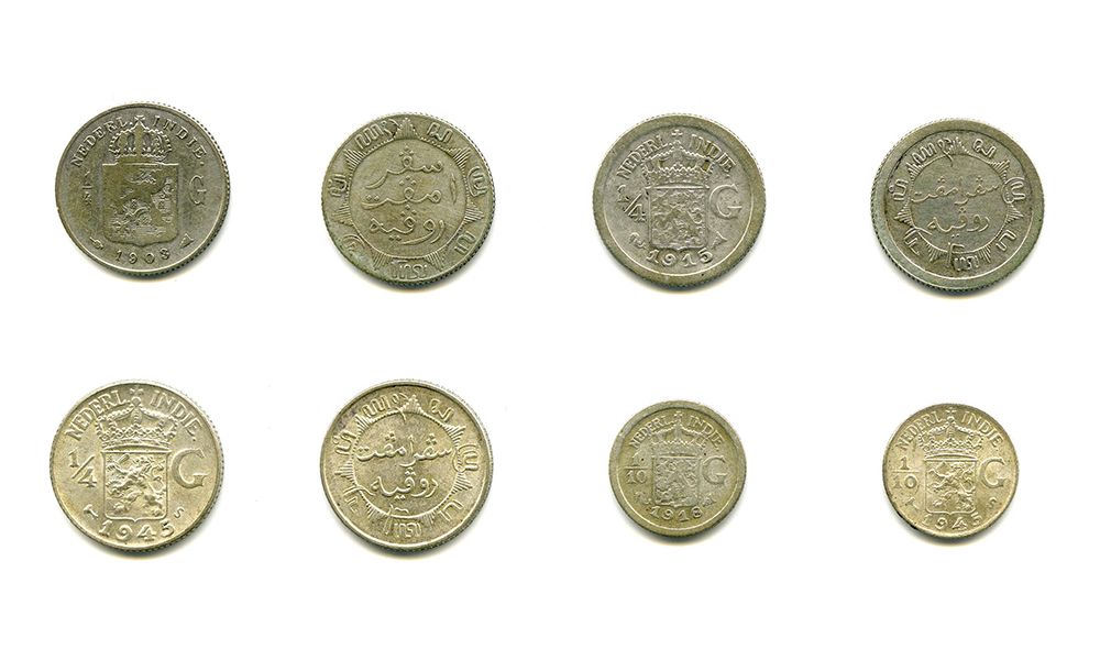 1/2 Gulden 1903, 1906, 1907, 1908, 1909 (KM 310), 1910, 1911, 1912, 1913, 1914, 1915, 1917, 1919, 1920 (x2), 1921, 1929, 1930 (KM 312), 1938 (x2), 1941 (x4), 1942 (x2), 1945 (x2) (KM 319); 1/10 Gulden 1910, 1911, 1912, 1913, 1918, 1919, 1920, 1930 (KM 311), 1938, 1941 S (x2), 1941 P (x2), 1942 S (x2), 1945 P (x2), 1945 S (x2) (KM 318); 5 Cents 1913 (x2), 1921 US$35, 1922 (KM 313); 2 1/2 Cents 1914, 1920 (x2), 1945 P (x2) (KM 316); 1 Cent 1914, 1920, 1929 (KM 315), 1936 (x2), 1937, 1938, 1939, 1942 P (x2), 1945 P (x2), 1945 D (x2), 1945 S (x2) (KM 317); 1/2 Cent 1914, 1916, 1932, 1933 (KM 314.1), 1934, 1935, 1936, 1945 (x2) (KM 314.2); 2 Cents (Duplo Duit) 1838 J (KM 291); 1/2 Stuiver 1823 S (KM 285); 1/4 Stuiver 1826 S (KM 287)