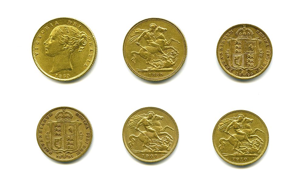 Ouro - Libra 1860 (KM 736.1), 1880 (KM 752); 1/2 Libra 1890, 1891 (KM 766), 1907, 1910 (KM 804)