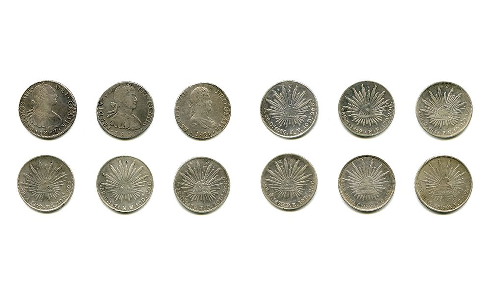 Carolus IIII - 8 Reales 1797 Mexico KM109; Fernando VII – 8 Reales 1809 Mexico KM 110; Fernando VII – 8 Reales 1821 Lima (Peru) KM 117.1; Moedas de 8 Reales (160 moedas); Alamos KM 377; 8 Reales A 1870 DL; As 1880 ML, 1881 ML, 1886 ML e 1888 ML; Chihuahua KM 377.2