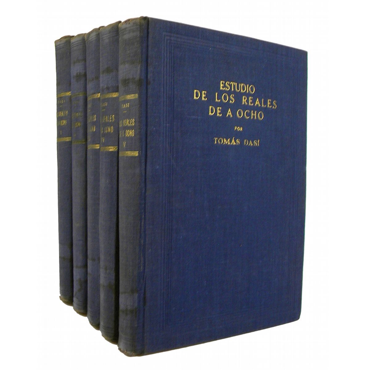 Dasí, Tomás. ESTUDIO DE LOS REALES DE A OCHO, TAMBIÉN LLAMADOS PESOS, DÓLARES, PIASTRAS, PATACONES O DUROS ESPAÑOLES. TOMO PRIMERO-TOMO QUINTO. Valencia, 1950-51. Five volumes, complete. 8vo, original matching blue cloth, gilt. 102, (2), cclxix, (11); 232, (2), cxcvi, (12); 223, (1), ccciv, (12); 269, (3), clx, (20); 159, (1), clxxxiii, (1), 78, (10) pages; numerous text illustrations of coins. Some joints cracked, as often seen on these; endpaper stains. Very good. An indispensable reference. A notoriously fragile work, printed on inferior paper and poorly bound. Clain-Stefanelli 11342*. Grierson 171. Mateu y Llopis 199.