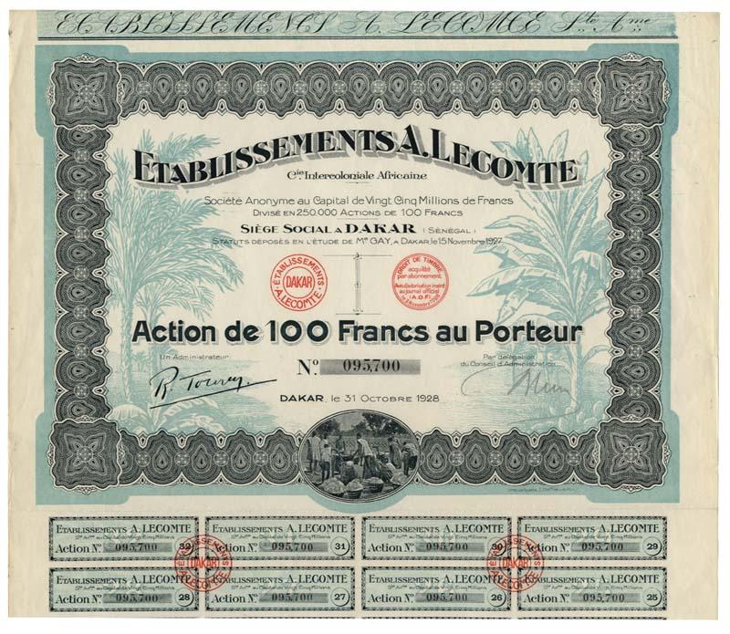 1928, Bond for 100 francs. Black/Teal. Bottom center vignette of people working. Attached coupons. Uncancelled and fine.