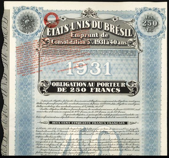 Brazil, 1926, 250 Francs, Issued and uncancelled bond, Black on ornate blue border and underprint, Minor stains and edge splits, otherwise VF.