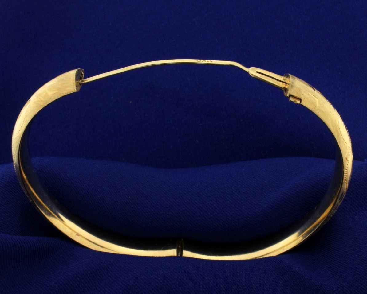 In 14k yellow gold. Hinged for ease of putting on/removing. 2 3/8 inches in diameter, 8.2mm wide. 10.8g.