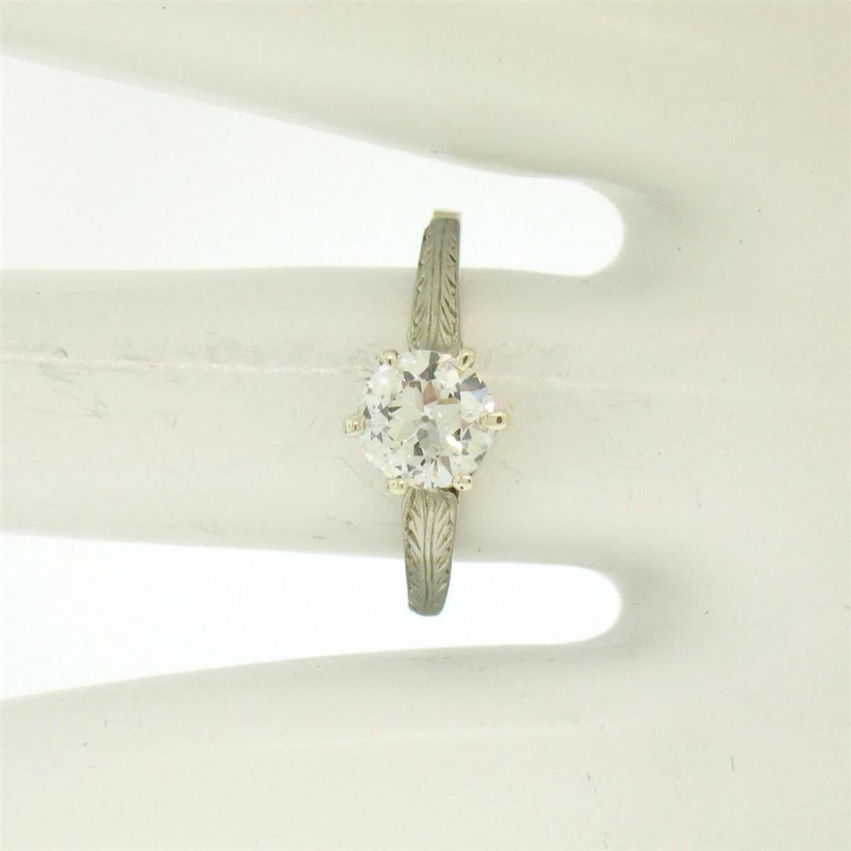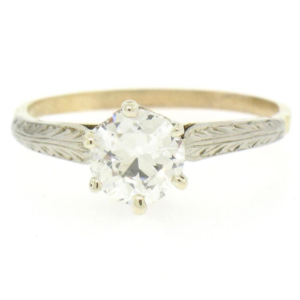 One Antique Etched 14k Two Tone Gold 0.80ct European Cut Diamond Solitaire Engagement Ring. Item Details: Material: Solid 14K Yellow and White Gold, Weight: 1.9 Grams, Stone(s): (1) Natural Genuine Diamond - Round European Cut - Prong Set - E Color - VS1 Clarity, Total Carat Weight: 0.80ct (Exact), Ring Size: 6.75 (We can custom size this ring.), Ring Width: 7.45mm, Ring Height: 7.98mm rise off the finger, Condition: Antique engagement ring w/ original finish. Excellent, ready to wear condition!